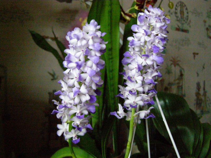 Rhynchostylis coelestis. Редкостью не назовешь. У многих есть. Совершенно прелестная форма . Высота 15 см. размах 25 см. На самом деле, листья длинные, но... Выглядят как дуги, ну очень сильно вниз загибаются, за дно корзинки заходят, буд-то листьями корзинку обхватывает,в быту маленькая орхидейка, везде поместится. Получается, купается с листьями, до половины. Цвел, как и положено,весной.букетики,конечно,чудные. Сильный цветочный аромат в первой половине дня. Тоже хватает на всю комнату.