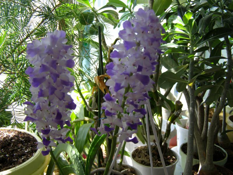 Очень любит пить. полив обильнее, чем другим вандовым. В подтверждение, наращивает боковые корешки, много. Вообщем,красавец. Вопреки мнению, что ринхам нужна сильная подсветка, зацвел на том окне, где подсветка рассчитана для фаленопсисов зимой. Правда, висел к ней близко.