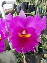 Cattleya labiata var. purpurea - тепалии интенсивного тёмно-красного цвета, губа более тёмная с жёлтым внутри.