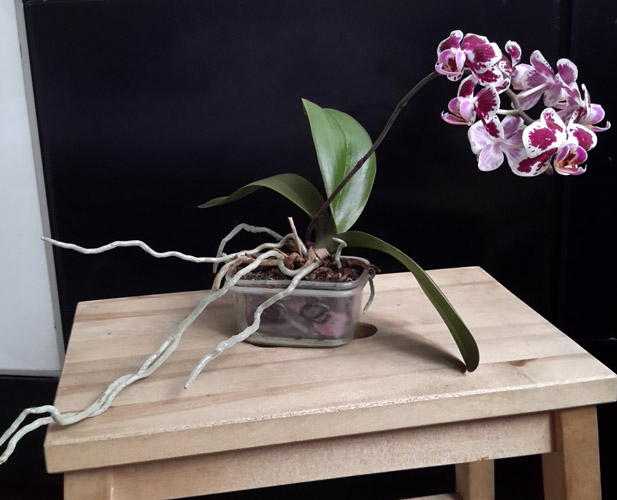 Забавное существо. Получен цветущим. Жаль, что не сфотографировала по приходу, но точно помню, что был полосато-симпатичным, приближенным к фото в каталоге. Сначала я решила не пересаживать, пока не зацветет... Зацвел