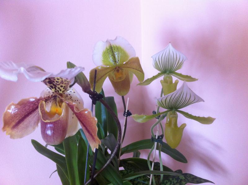 Илона, слева американский гибрид а полосатики Paph. Maudiae.