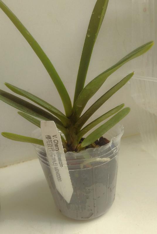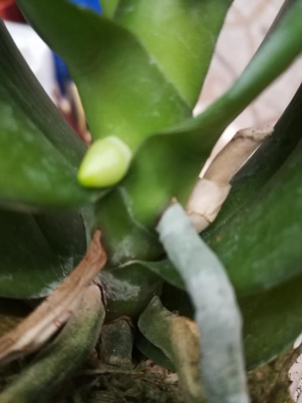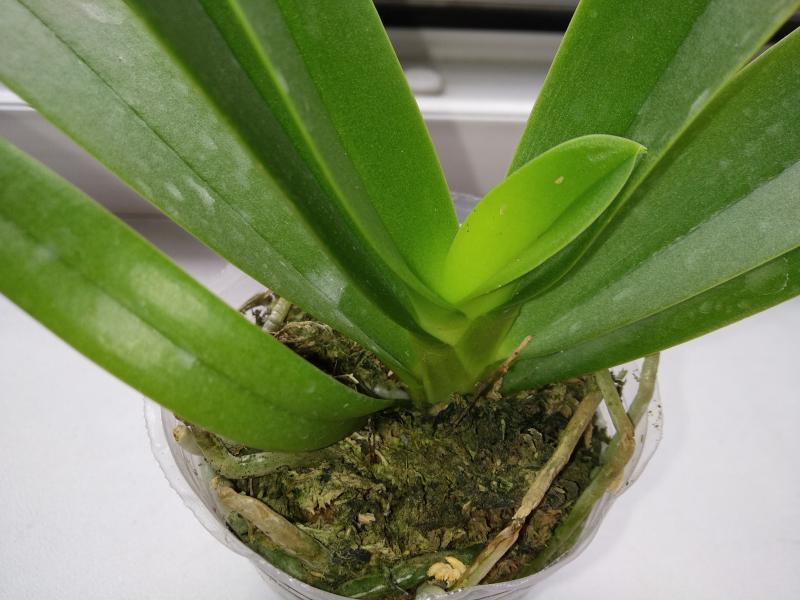 Вандофинетия пришла в коре, но кажется росла с голой корневой. Наверное просто насыпали коры для сохранения тругора. Растение небольшое, пять пар листьев, самый большой листик 10 см. Корни есть. Похоже из нижних пазух лезут цветоносы, а может это детки, время покажет.