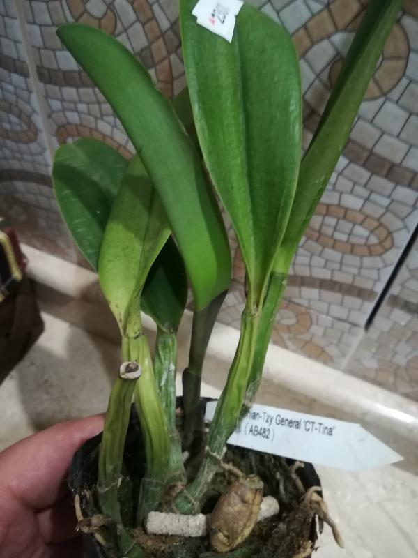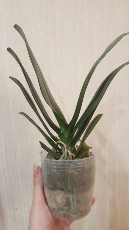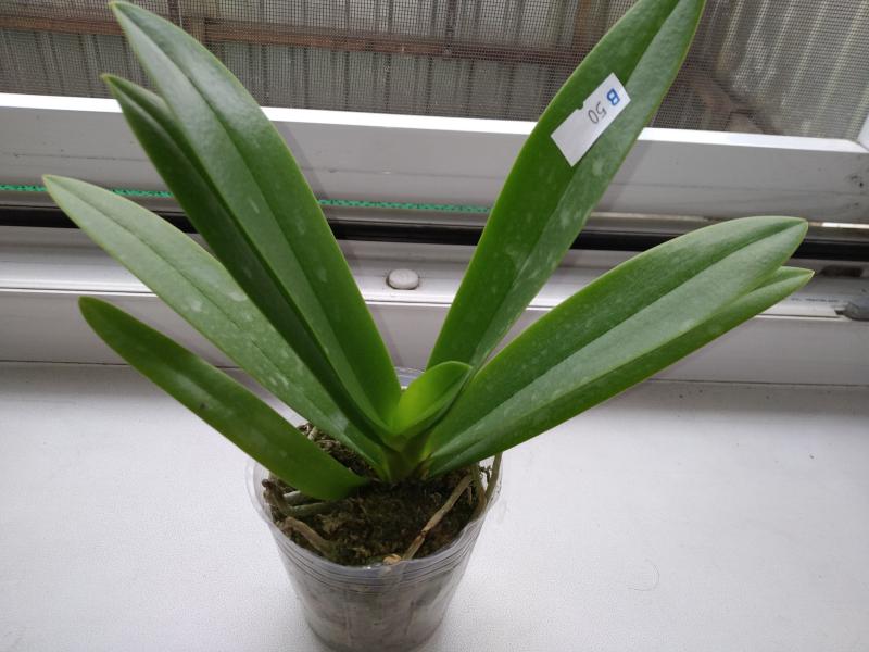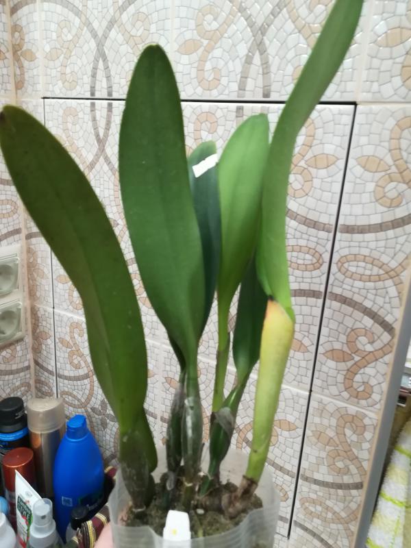 Каттлея семь бульб, высота самой последней 15 см, корни и листья чистые, тругор хороший. Был цветочек, но сухой.