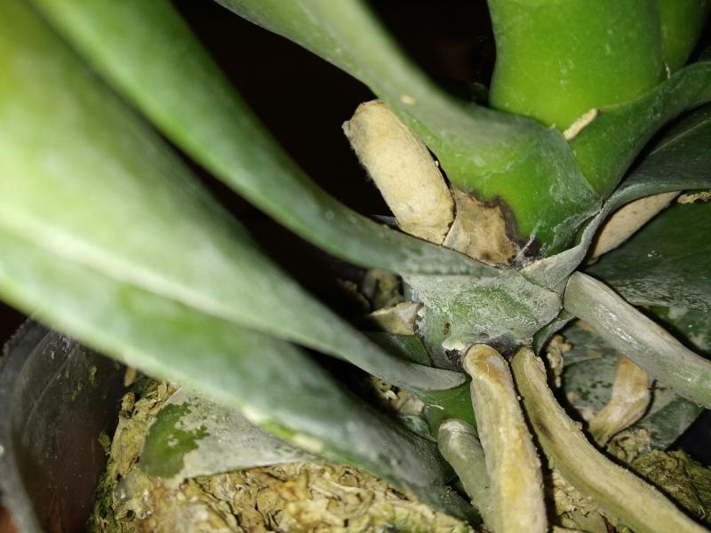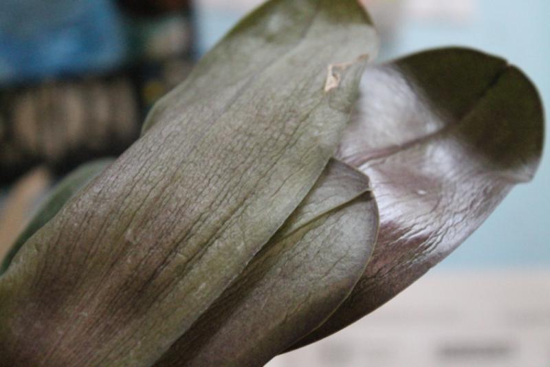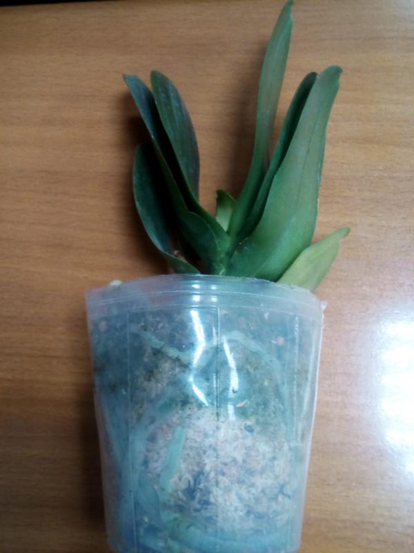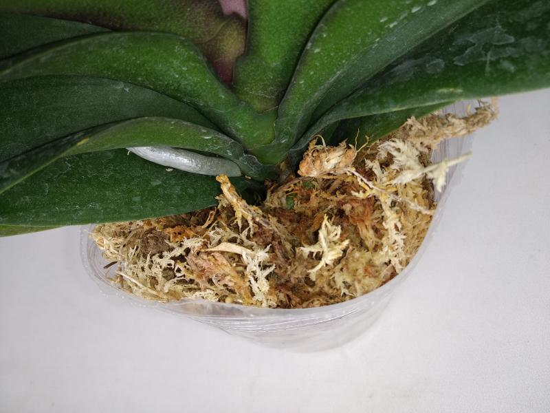Фаленопсис соответствует указанному размеру, ранее не цвёл, осталось 2 пары листьев, остальные отсохли, тургор листьев сильно снижен,шейка и основание листьев затянуто паутиной, посажён в мох, корней много, есть совсем новые, общее состояние неплохое , тоже поставила на водопой.