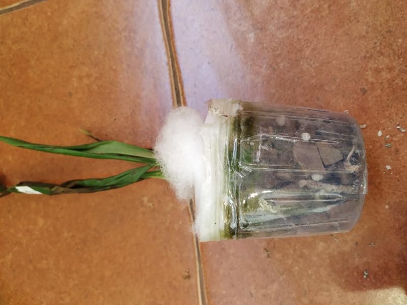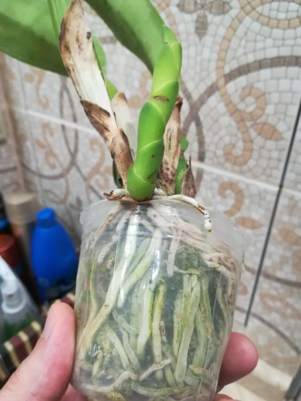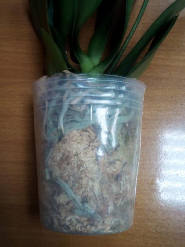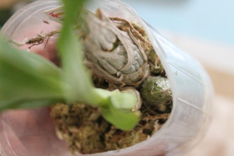 Дендробиум дорогу перенёс неплохо, посажён в мох, всего 5 бульб, один новый рост , см15, на 2 старых бульбах остатки цветоносов, корней во мху не просматривается, поставила отмокать.