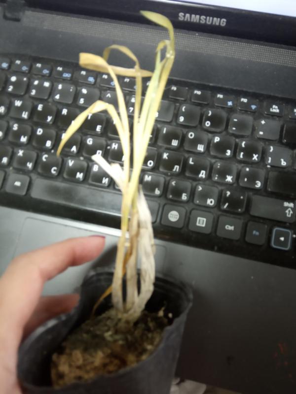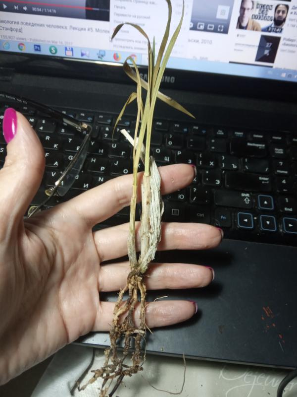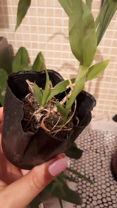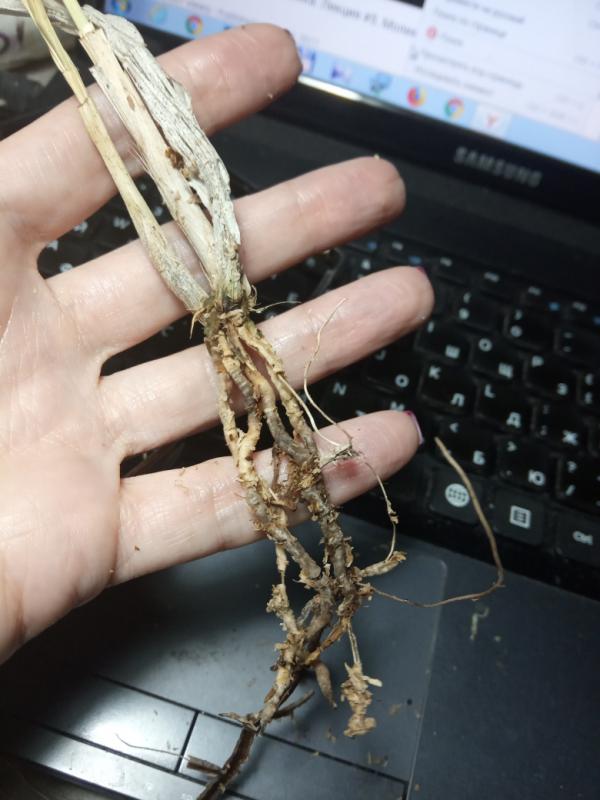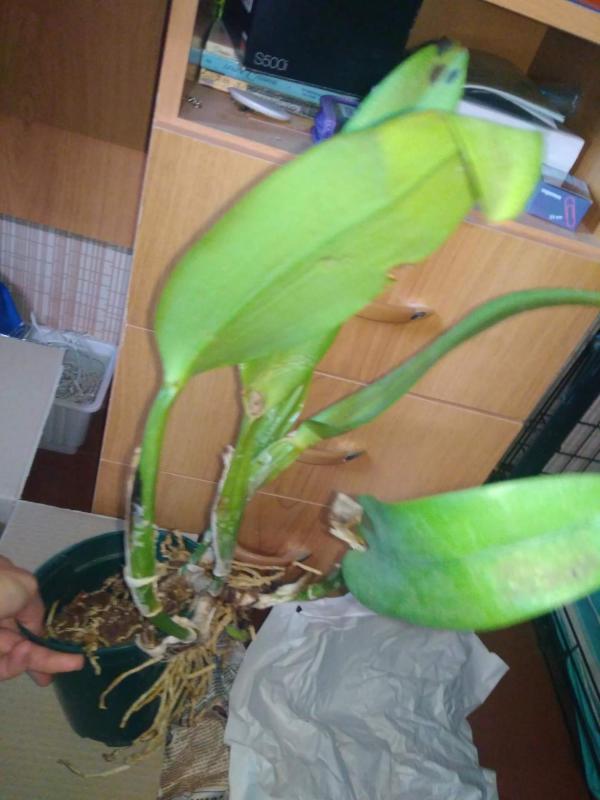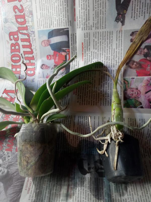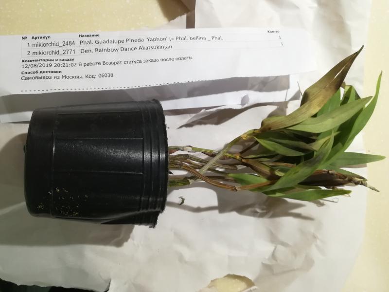 Дендробиум (якобы Den.Oriental Smile x sib) ещё приличен. Корни есть. Живые. Но само растение усушено и надломано.