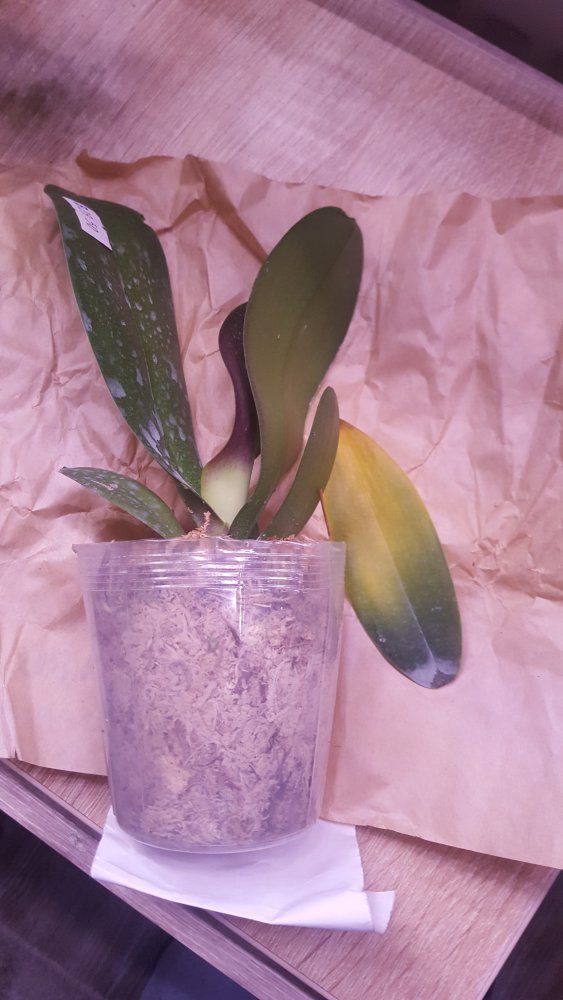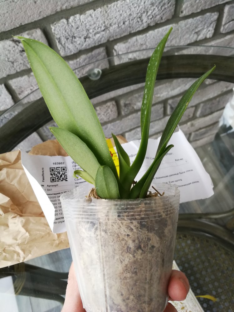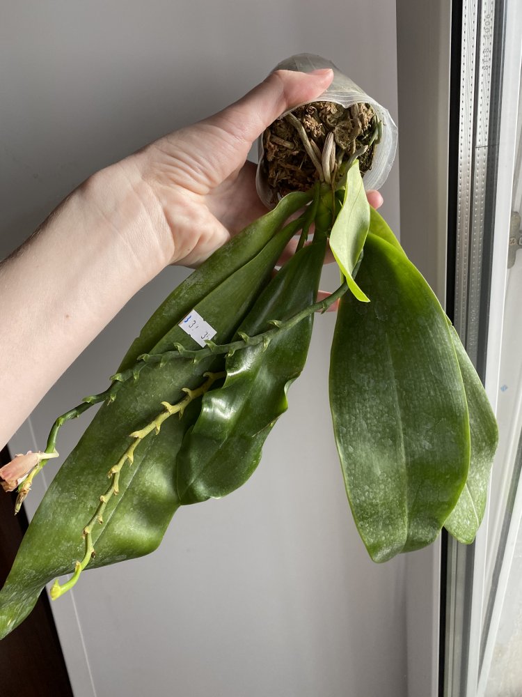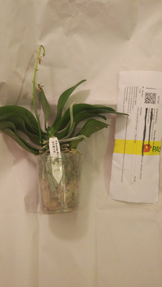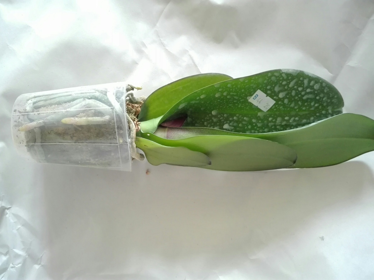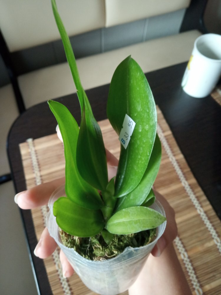 Из заказа пришло пока одно растение Phal. Tying Shin Fly Eagle x Phal. tetraspis 'C1' - 2,5. Мы переночевали дома, не устаю им любоваться, блестит, листики нежненькие, маленькая, но гордая пташка?. Из маркировки надпись В33 55 на обертке поставщика. От шеи что-то свежепробившееся, Скорее корешок.. Корней не много видно, наверно только пересадили, но те, что видны-растущие. Короче, ребята, довольна как слон я этой моськой. Будем ждать второго товарища из этого заказа, надеюсь, и он порадует.