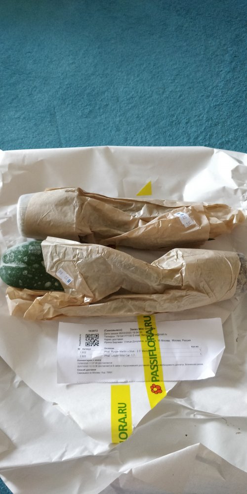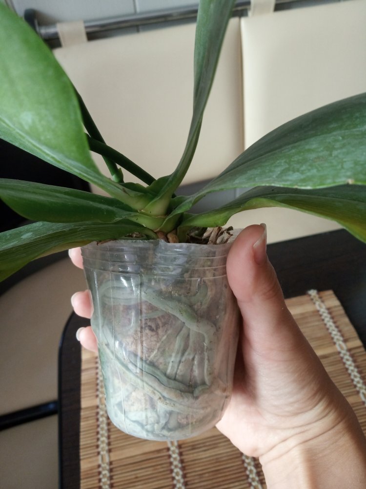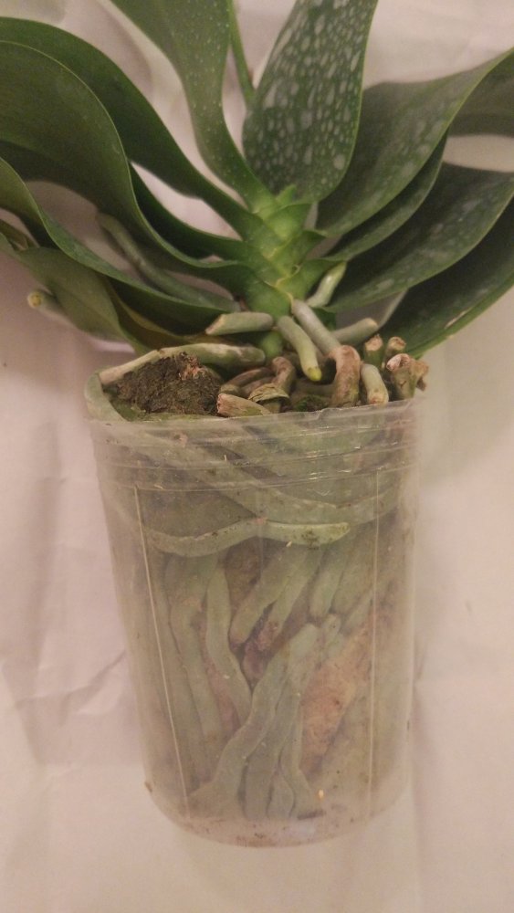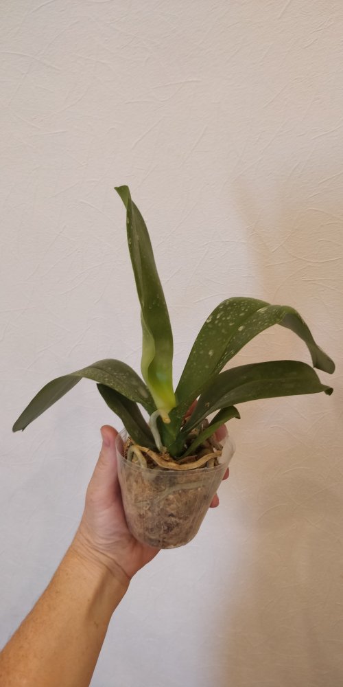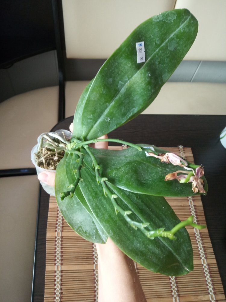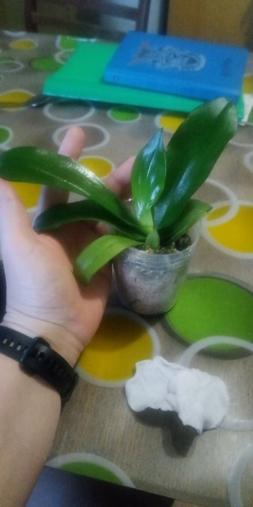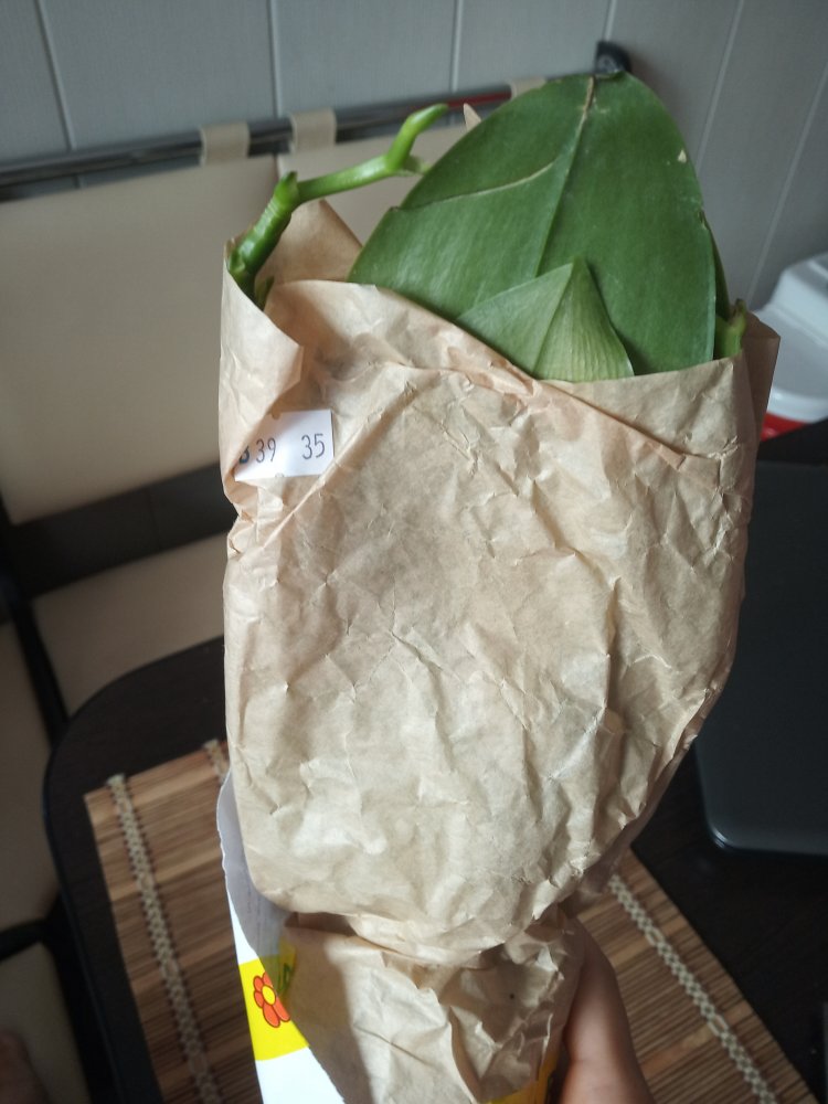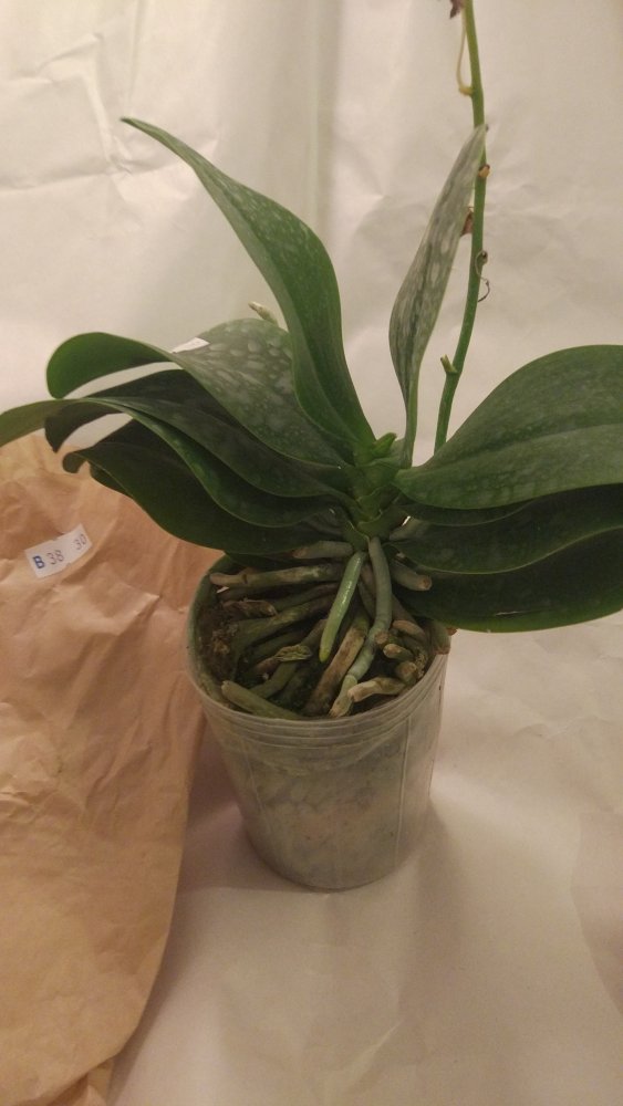 Из заказа пришло пока одно растение Phal. Tying Shin Fly Eagle x Phal. tetraspis 'C1' - 2,5. Мы переночевали дома, не устаю им любоваться, блестит, листики нежненькие, маленькая, но гордая пташка?. Из маркировки надпись В33 55 на обертке поставщика. От шеи что-то свежепробившееся, Скорее корешок.. Корней не много видно, наверно только пересадили, но те, что видны-растущие. Короче, ребята, довольна как слон я этой моськой. Будем ждать второго товарища из этого заказа, надеюсь, и он порадует.