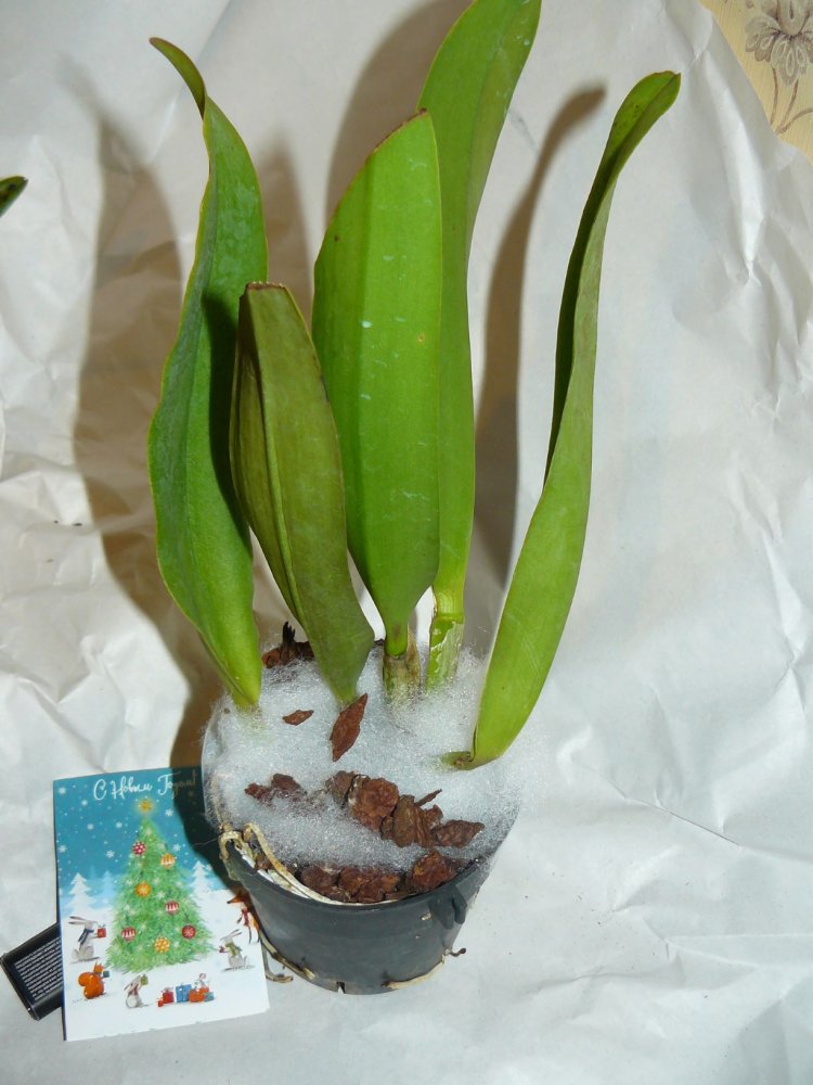 Каттлея шикарная! 5 больших бульб, куча корней (торчат из горшка снизу), сидит в чистой коре. Сверху кора прикрыта, чтоб не высыпалась. Я думала, она меньше будет..На этикетке - А19 . И в подарок - прикольная открыточка с Новым Годом! Ух, приятно. Спасибо.