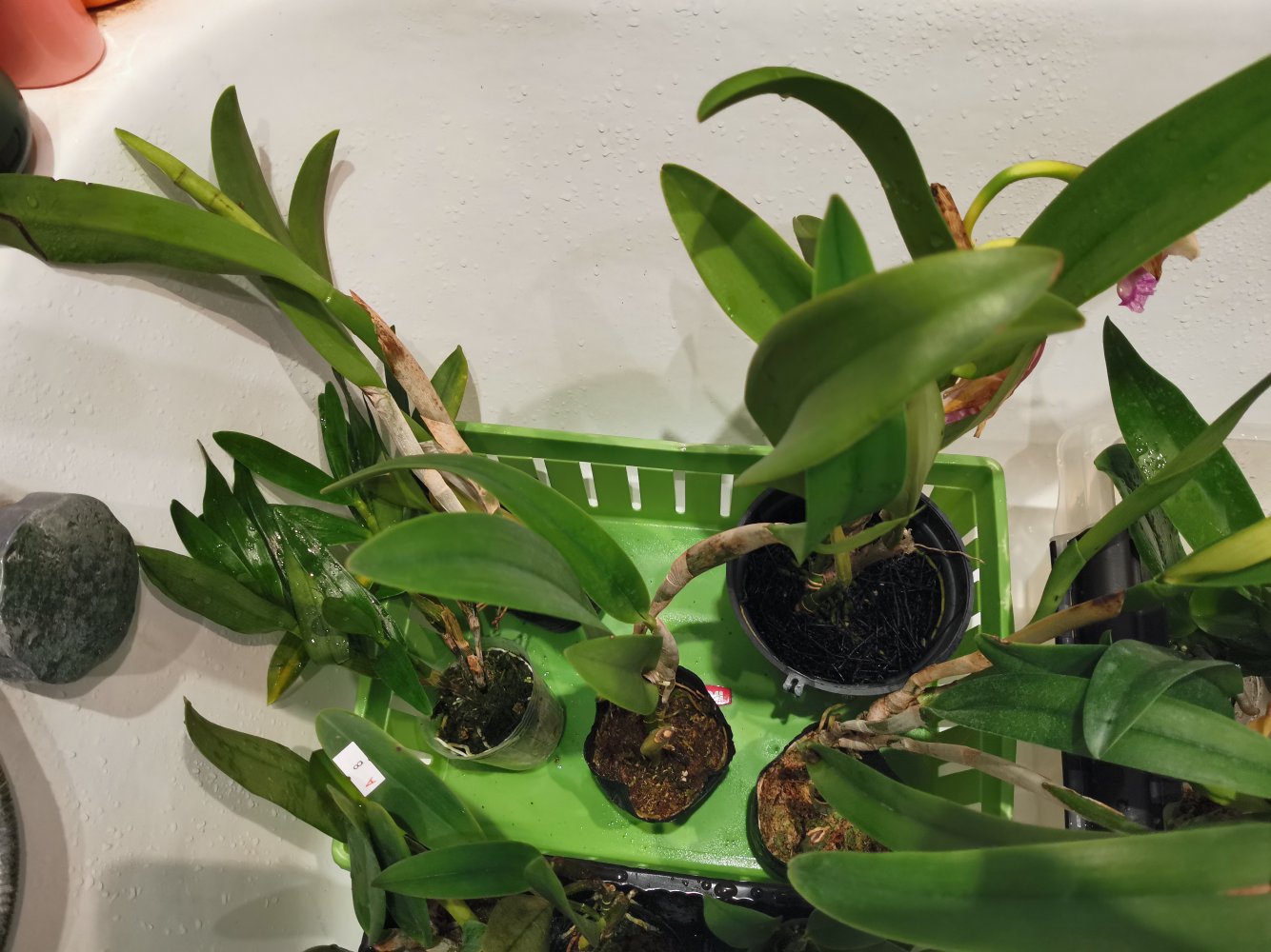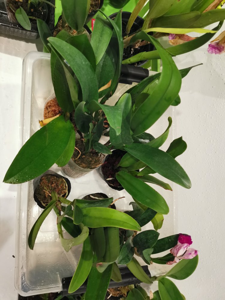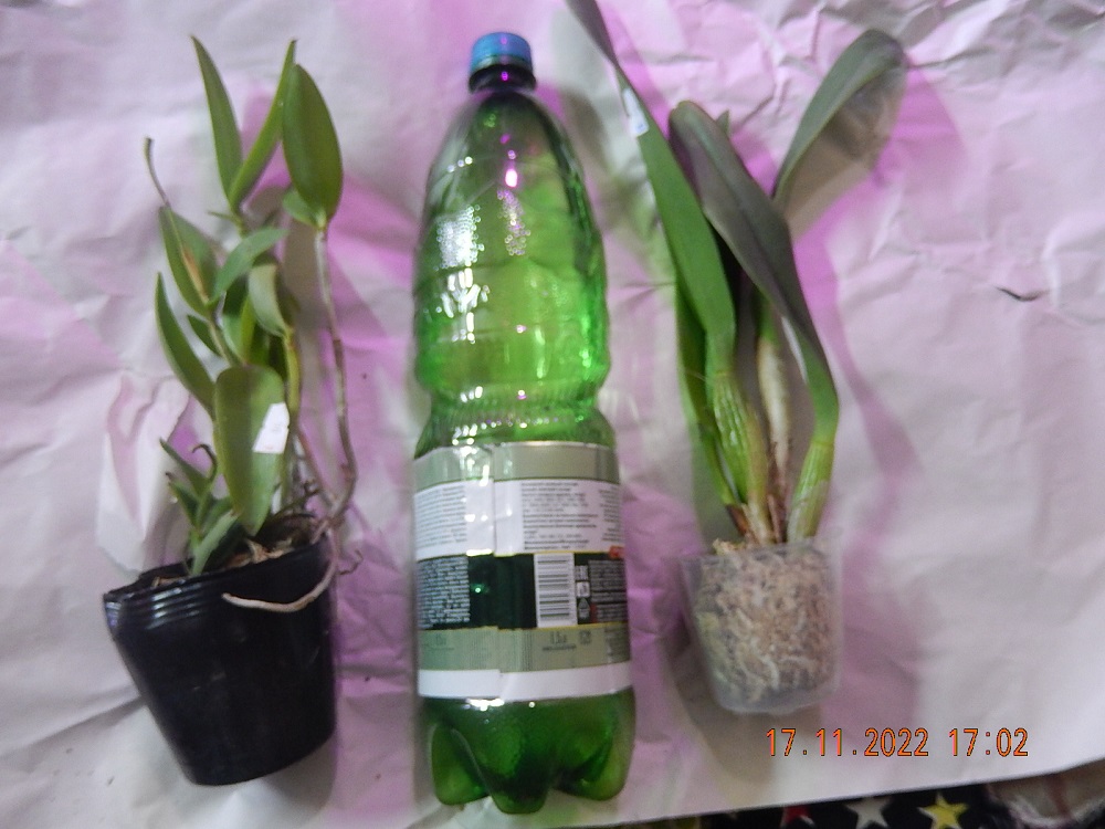 Каттлеи неплохие, 1,5 л бутылка для масштаба. Левая явно не триана, два раза цвела у Мики (срезанные цветоносы). Правая возможно и триана какая-нибудь - крепкая, молодая, хороший новый рост.