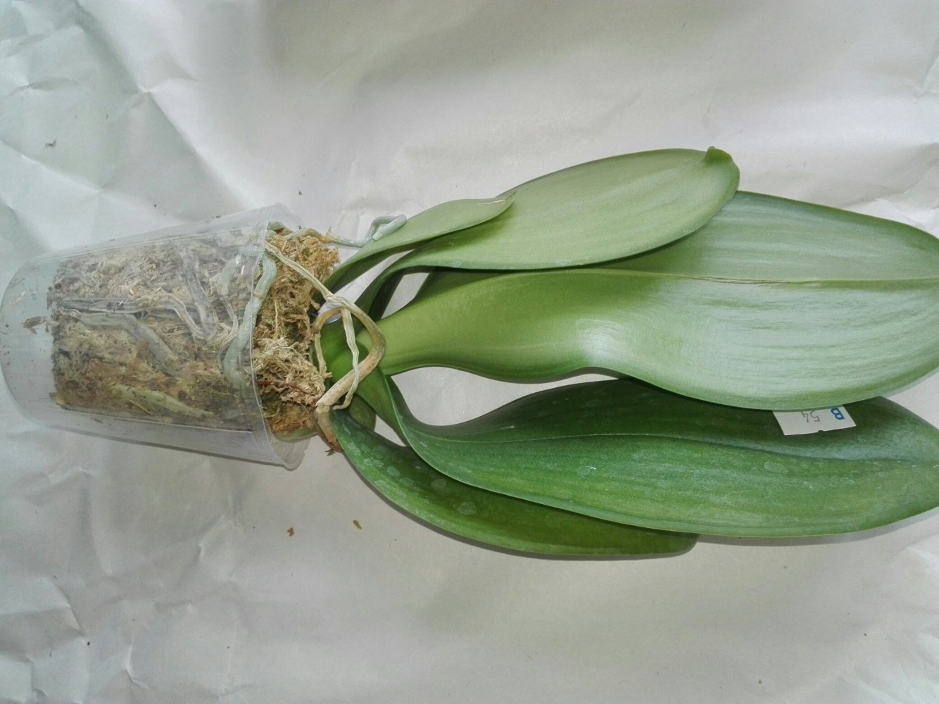 Здоровое растение в сухом мхе в размере 1.7 вместо 3 (!). Листья в тургоре. Корни в порядке.