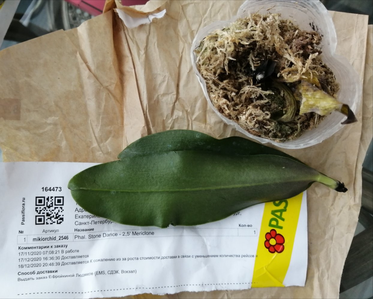 Заказ 188965 от 20/06/2021. Phal. (Morning Moon x Kikuno Taiyo) Apollon 1,7. Получен в день смсв ПВЗ, в дороге 1 час в городском транспорте. Доехал хорошо. Пришел в размере 2,5. Мох просушен растение здоровое, несмотря на то, что на упаковочном пакете просохшие следы от плесени. Ярлыка нет. Надеюсь без замен. Ждала долго, рада получению качественного растения. В ожидании ещё заказов от Мики ( статус "доставляется"🤗). Спасибо всем причастным.