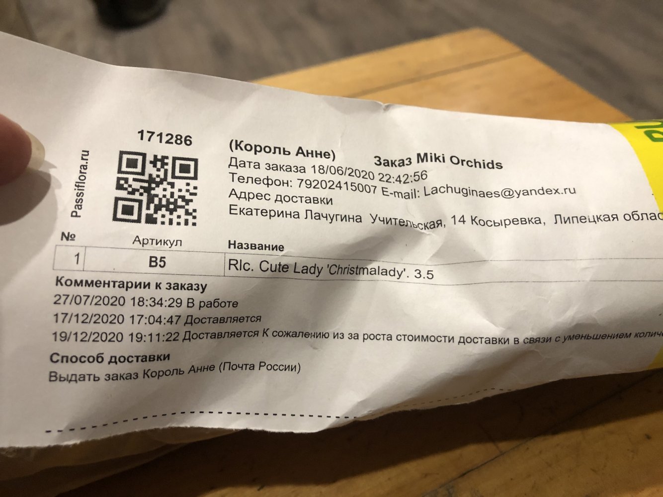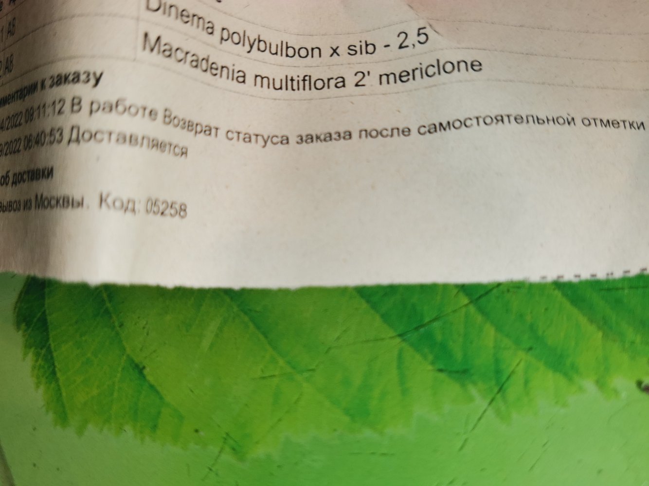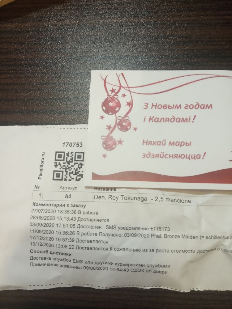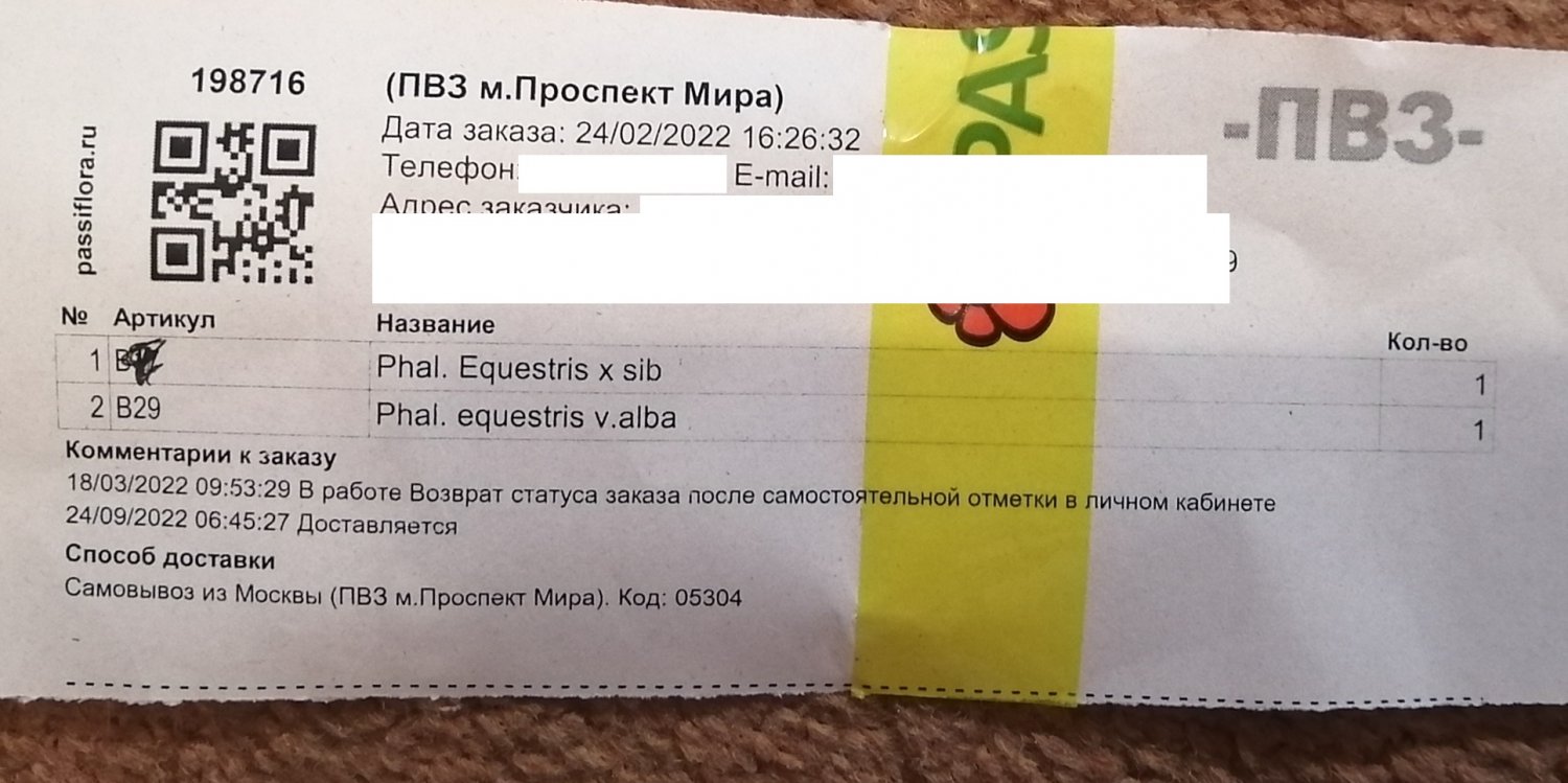 В заказе одно растение: paph. Daisy Barclay 3,5. Получено через день после смс в ПВЗ. Пока ждала, заказ сильно подрос в цене. Реально пришло в горшке 2,5 небольшое, но крепенькое. Код на наклейке соответствует накладной.