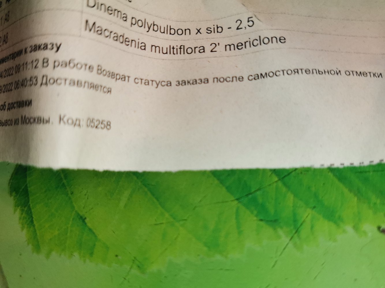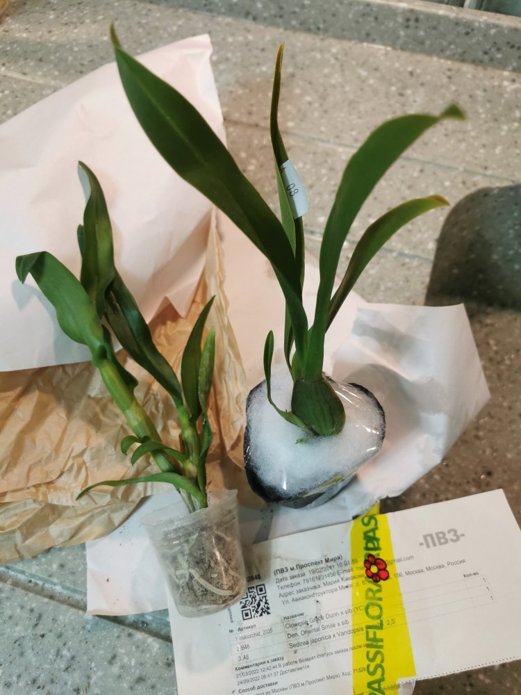 В заказе три растения, но пришло только два, одно из них — замена. Видимо, замена коснулась гибрида седиреи - напротив нее стоит код (видно на фото в накладной), в то время как гибриду кловезии такой характерный код не присвоен. Так что надеюсь, что еще не все разобрали, и получу ее позже.
