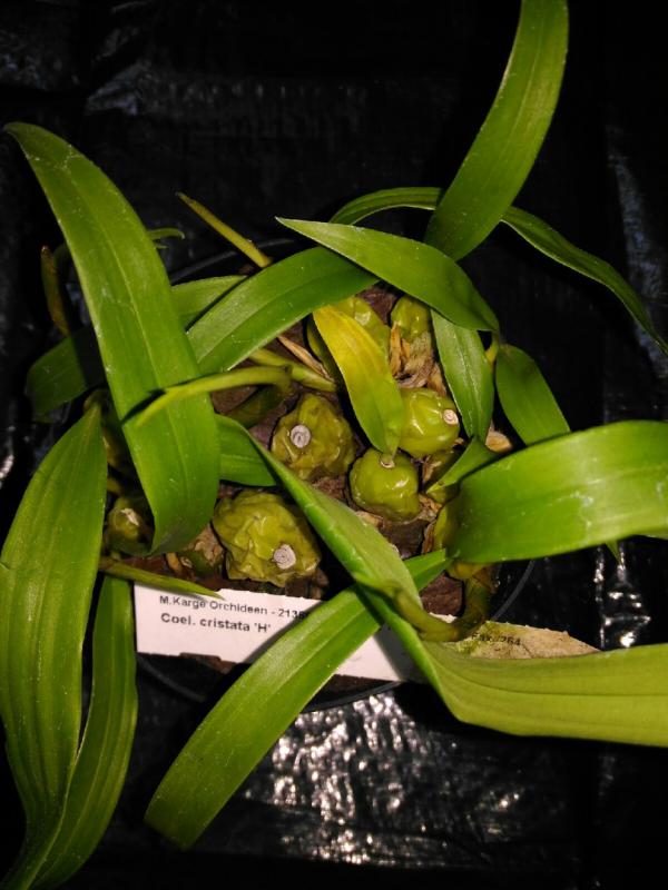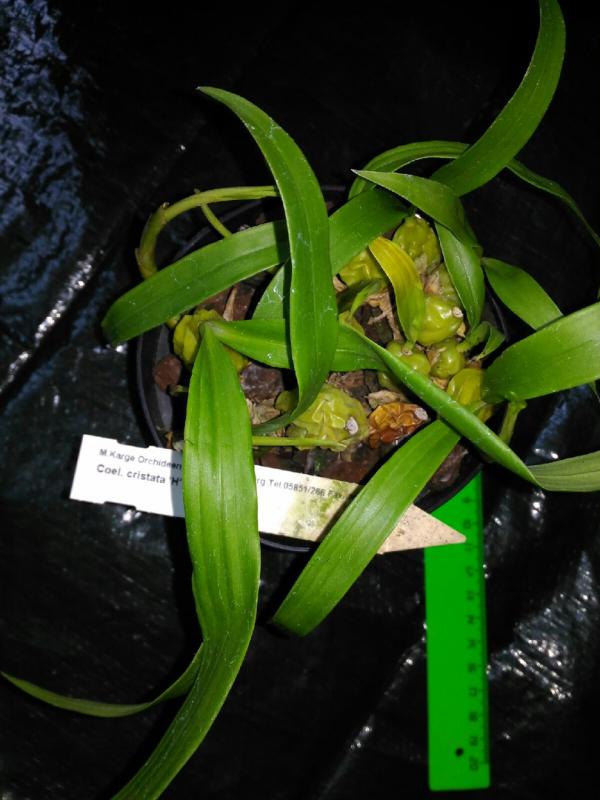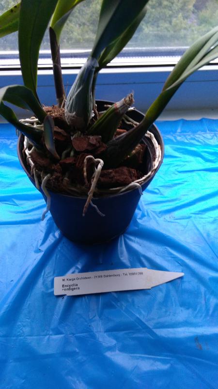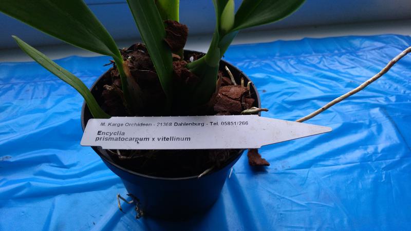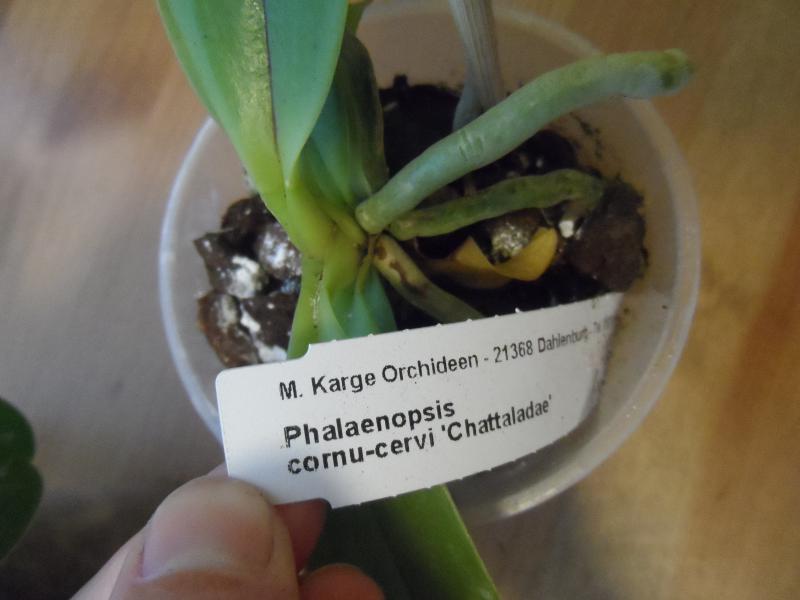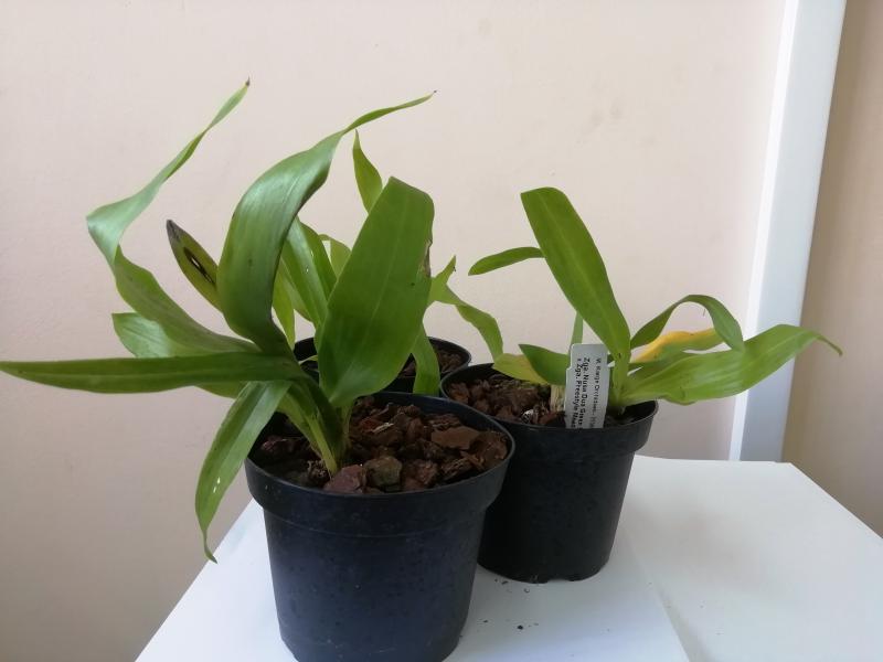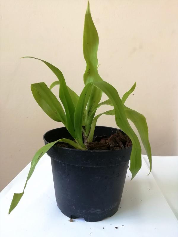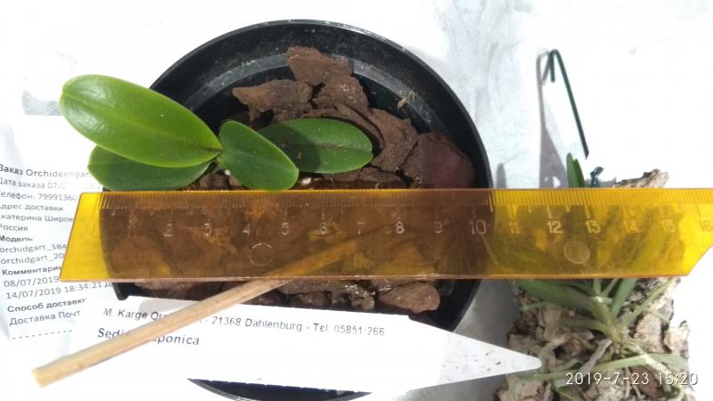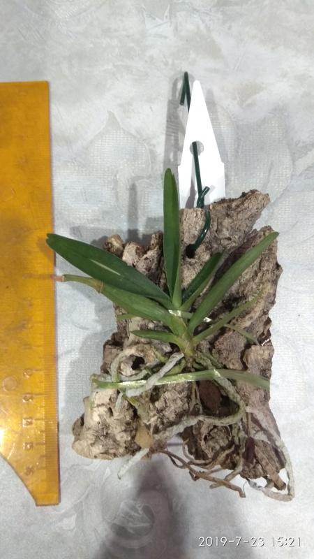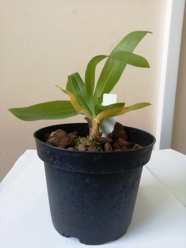Горшочек 10 см, в коре, небольшое растение. Корни живые, есть новый рост, состояние хорошее. Есть бирка.