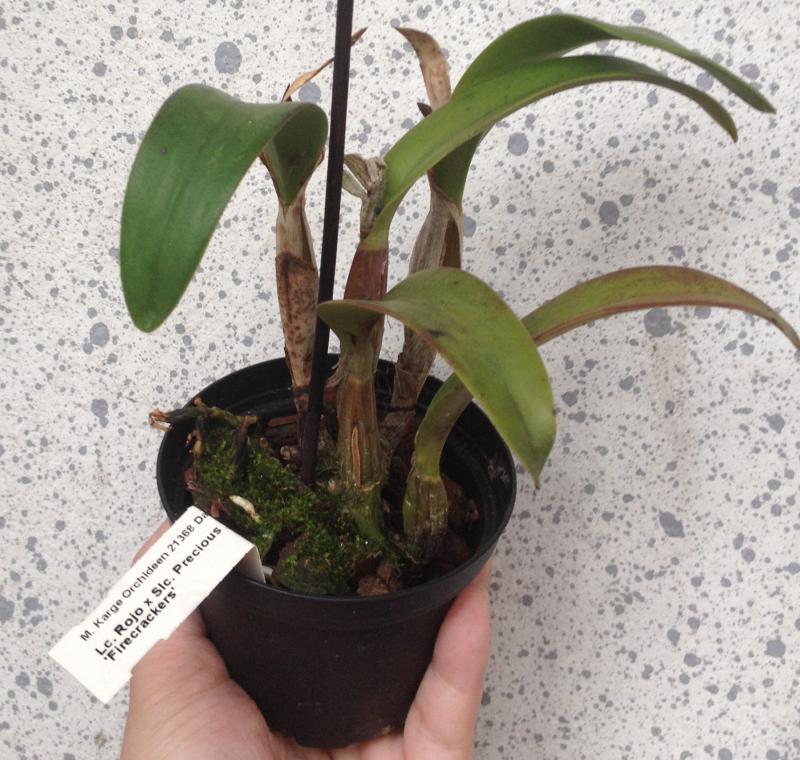 Sophrolaeliocattleya Mea Hawkins Miya длинная крепкая куртинка, растущая в двух направлениях, насчитала 18 бульб хорошенькая:), на такой деревяшке с крючком, удобно сразу можно вешать на балкон:
