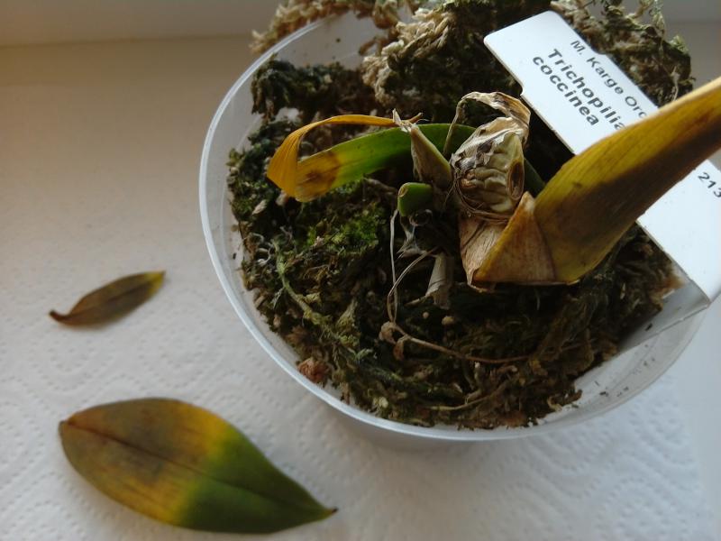 Что-то как-то не сложилось у меня с этим заказом. Заказ из 5ти изначально растений дошел 3мя частями. Последняя часть - печаль. Из 2ух якобы дошедших растений, в итоге - пришло одно. Состояние Trichopilia coccinea можно оценить как - пациент скорее мертв. Tillandsia usneoides пытаюсь разыскать, но особой надежды нет.