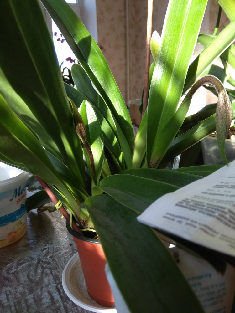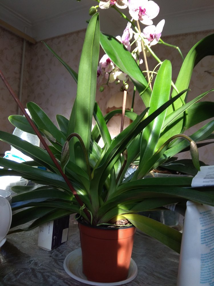 Летом 2018 года получила Paph. Rosy Dawn Hibride. Первого домашнего цветения не получилось- как оказалось, под цветком стояла настольная лампа и от ее тепла завял бутон. Прошло 2,5 года- никаких изменений, в январе на сутки отключили отопление по городу, температура понизилась и теперь цветок растит аж 5 цветоносов! Вот будет красота!!!
