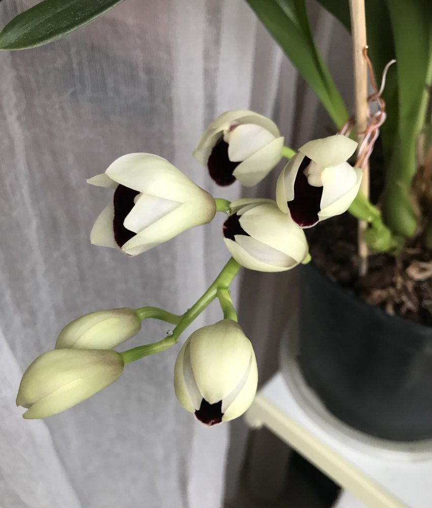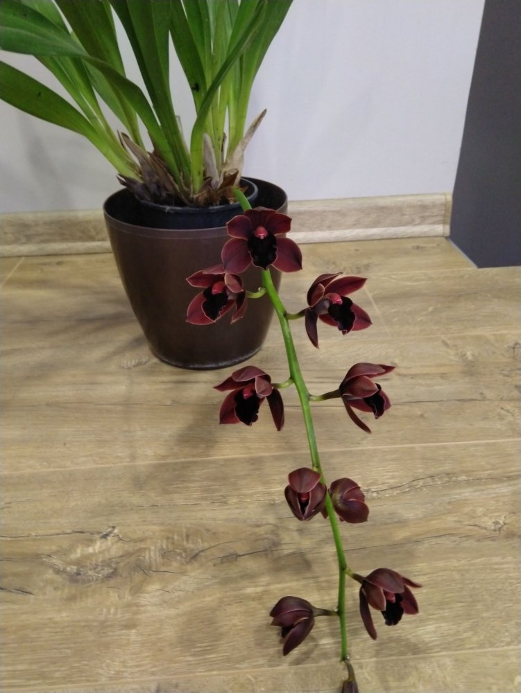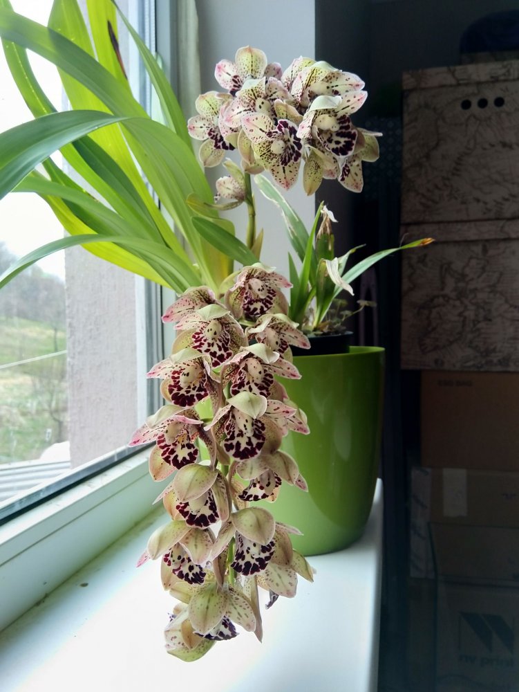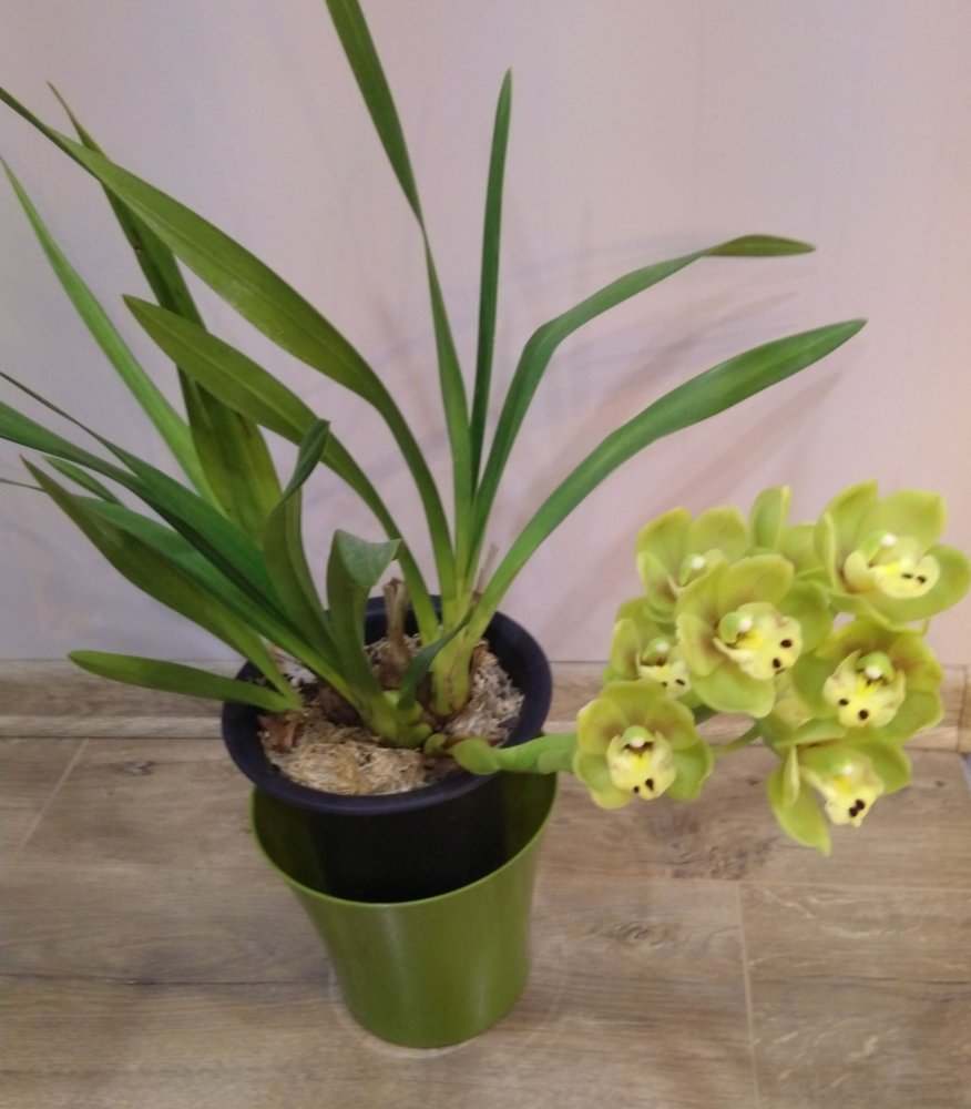 Есть ещё один полуотказник от цветения Cymb Kiwi Midnight (т.е. он цветоносы выпустил, но они не развиваются), вот его прошлогоднее цветение