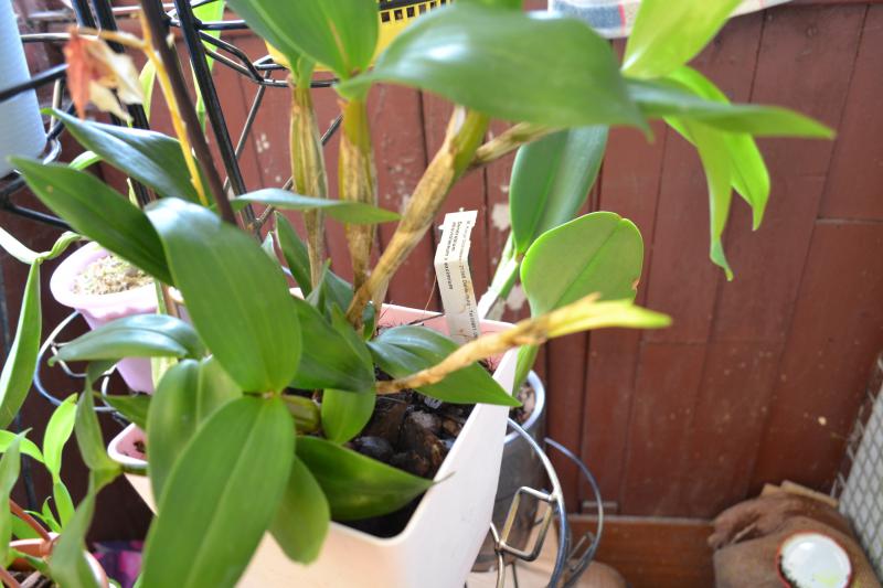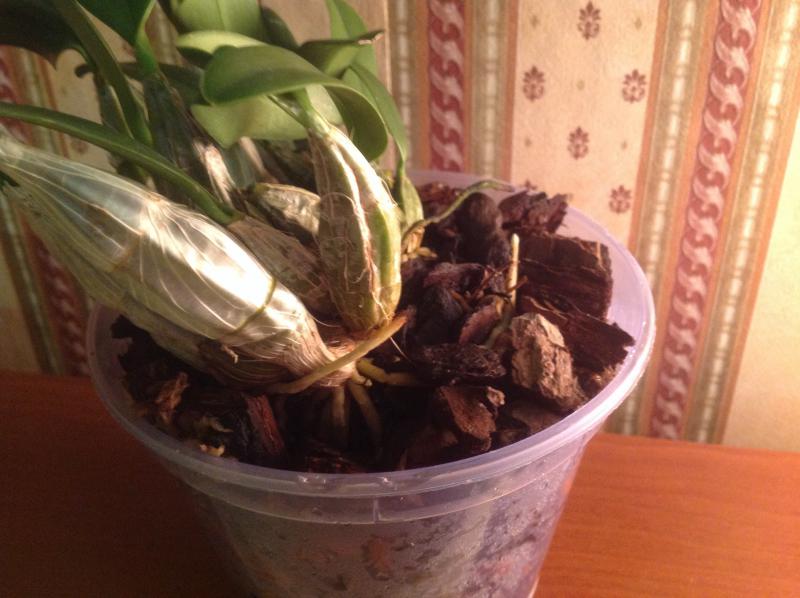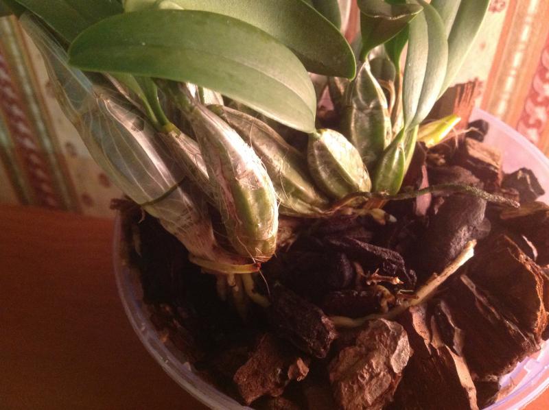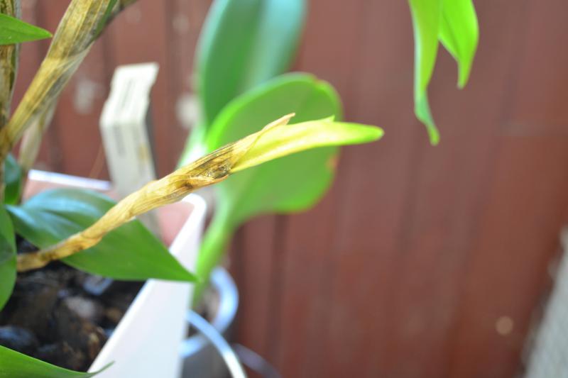 Вам нужно будет вытереть отрезать пропавшую бульбу и выкинуть, осмотреть где еще есть белый налет, вытереть его что бы ничего не осталось и устроить вашему дендробиуму теплый душ. Промойте эти места с мылом.