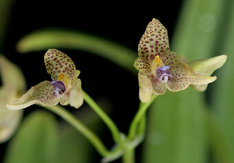 встречается в Гималаях, Мианмаре и Вьетнаме, где произрастает эпифитно на деревьях на высоте от 1000 до 2600 метров над уровнем моря. Псевдобульбы однолистные, грушевидной формы, размером около 5 см в длину и 3 см в ширину. Листья широкие, ланцетные, размером 15-20 см длиной и 4-5 см шириной, растут на длинной ножке (около 4-5 см). Цветоносы появляются у основания псевдобульб, в длину достигают до 30-40 см. На один цветонос приходится до 10 цветов. Цветы окрасом от бледно-жёлтого до бледно-зелёного, густо покрыты пурпурными пятнами, размером около 2-3 см в диаметре.