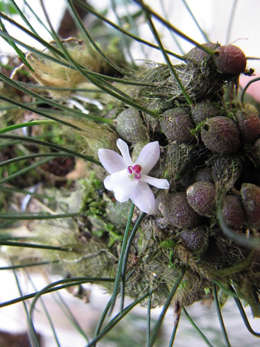 Очень короткий цветонос вырастает на верхушке молодой псевдобульбы. На каждом цветочном побеге появляется единственный цветок диаметром 1 см. Широко раскинутые чашелистики и более узкие, направленные вперёд лепестки обычно окрашены в белый цвет, иногда с розовым или светло-фиолетовым оттенком, особенно заметным на чашелистиках. Губа широкая, округлая, чисто-белого цвета. Низ боковых чашелистиков образует в месте соединения с основанием губы шпорец. Колонка покрыта пятнами аметистового цвета, в такой же цвет окрашена верхушка крышки пыльника.