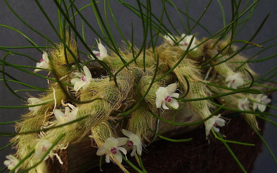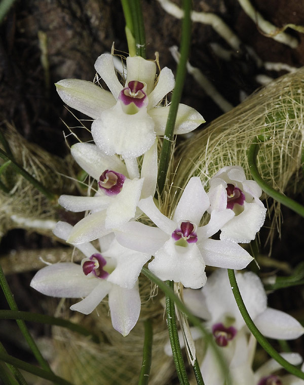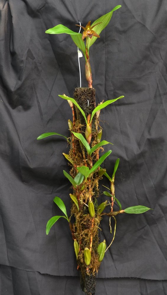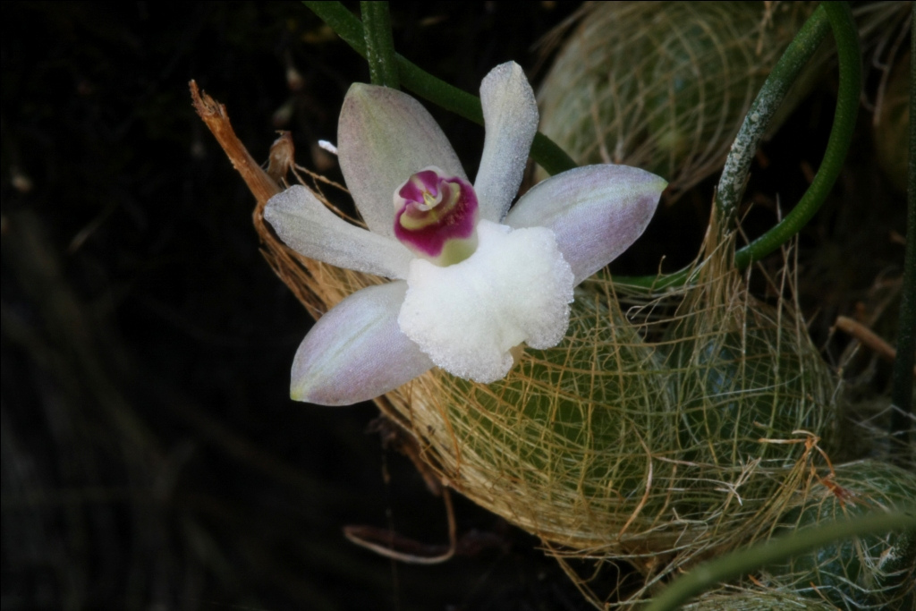 Псевдобульбы почти незаметны под покрывающими их жёлто-коричневыми волокнами, которые напоминают что-то вроде миниатюрных сетчатых корзин.