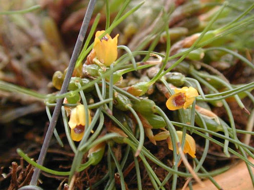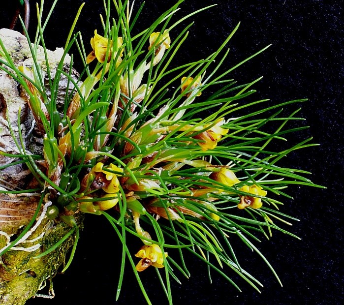 Это орхидея состоит из яйцевидных псевдобульб длиной 0.7–1.0 см. тесно размещенных вдоль ползущего и разветвлённого корневища. Со временем растение образует плотный ковёр.