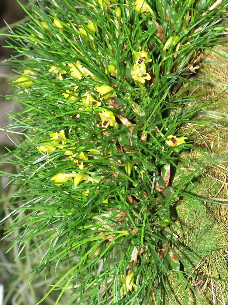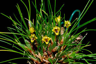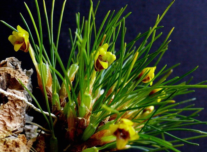 На верхушке каждой псевдобульбы появляется только один прямостоячий, игловидный, желобчатый лист длиной 2.5–7.5 см.