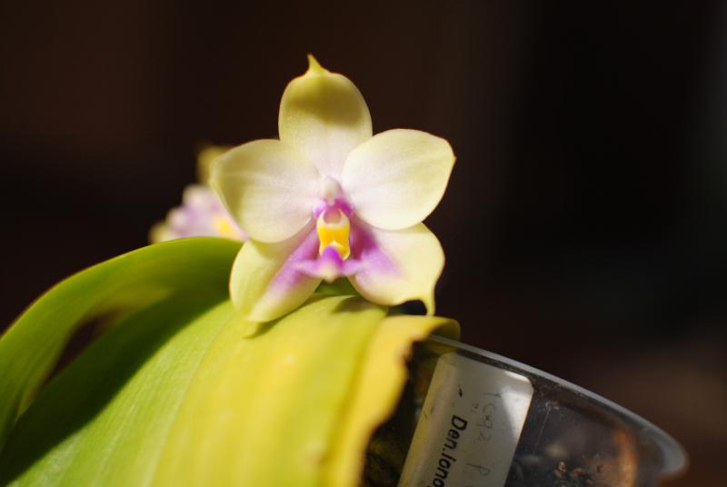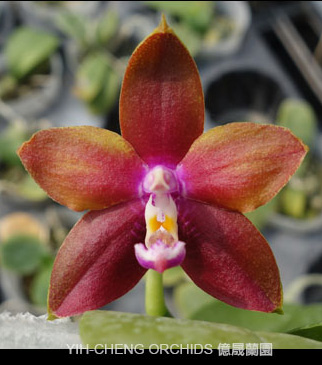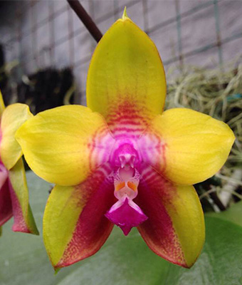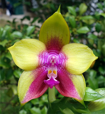 Лениво переводить, любой онлайн переводчик более-менее переведёт. Самое главное в двух словах - преобладание супержёлтого в общей палитре, половина нижних сепалий тёмно-бордовая.Two flowers and one bud on one inflorescence; sepals and petals vibrant yellow-green barred maroon proximally, lateral sepal inferior halves maroon, cinnamon brown apically, faint white halo; lip midlobe violet-purple, side lobes golden yellow proximally; column light violet; substance very firm; texture waxy; pleasing fragrance.
