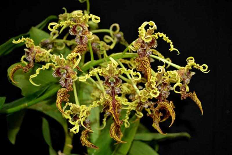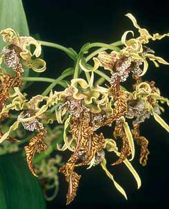 В качестве места дислокации растения идеально подойдут ЮЖНЫЕ, ЮГО-ЗАПАДНЫЕ и ЗАПАДНЫЕ ОКНА. Без обгорания (политая) орхидея может переносить прямое полуденное солнце в 50.000-70.000 Люкс, приобретая более светлый оттенок листьев и псевдобульб, тёмные окрасы могут краснеть. Солнечный свет должен быть не просто ярким, но и ПОСТОЯННЫМ, т.е. и весной, и летом, и осенью, и зимой, что существенно осложняет содержание данного растения в наших широтах, где интенсивность освещения очень низкая зимой. Выходом из ситуации служит установка над растениями ламп искусственного света - ФИТОЛАМП [подробнее об освещении орхидей ...], на период с конца сентября и до апреля. Общая продолжительность светового дня должна быть не менее 12-16 часов, иначе орхидея может просто-напросто не цвести.