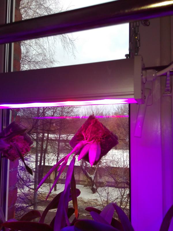 Теперь по результатам. Под лампами у меня каттлеи башмаки и всякие онцидиумные, поскольку только на кухне могу обеспечить прохладу. Окно маленькое, глубокий север и деревья перед ним. Лампы висят месяц - полезли листья у башмаков, новые росты у онцидиумных. Каттлеи тронулись в рост и росты жирные и загорелые. Если каттлея заложит здесь бутоны я буду рада. Хотя зимний рост на северной стороне всегда был жидким у меня. Т.е. разницу с прошлым годом без этих ламп я вижу.