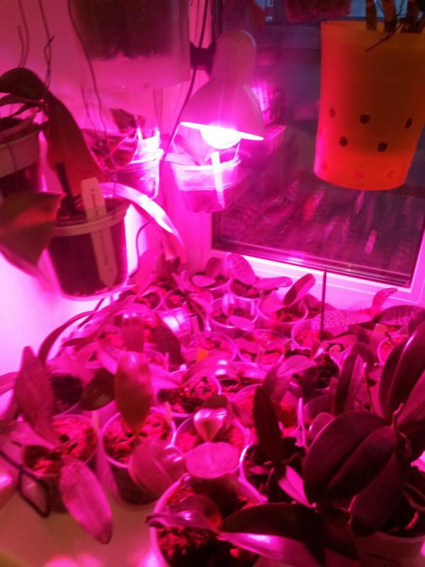 Такую лампу я брала напркат у Ирочки Led_i, за что спасибо ей огромное. Брала с целью определиться - нужно ли это мне и моим растениям. Освещался ей стандартный кошачий поддончик с разнообразными орхидеями во время моего отъезда на 4 недели. Высота лампы над растениями была 15 - 20 см. Нужно было пристроить её так, чтоб и весь поддончик освещался и не очень высоко получалось. По возвращении растения были осмотрены и выводы сделаны. Растения, подвергшиеся эксперименту - драгоценки, небольшие фаленопсисы, мелочь дендробиумов, подангис и толумнеи.