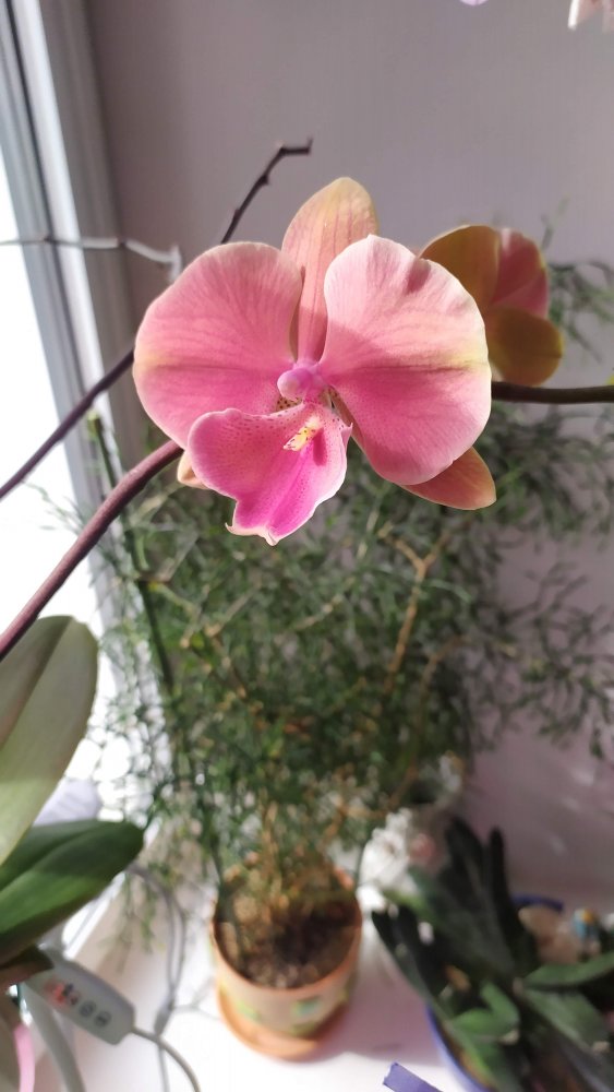 Пришел в августе вот такой малыш, крепенький, хорошенький, очень быстро адаптировался, выпустил цветонос и замечательный цветок в декабре. Пусть пока один, ничего страшного, маленький еще. Отцвел, жил дальше.