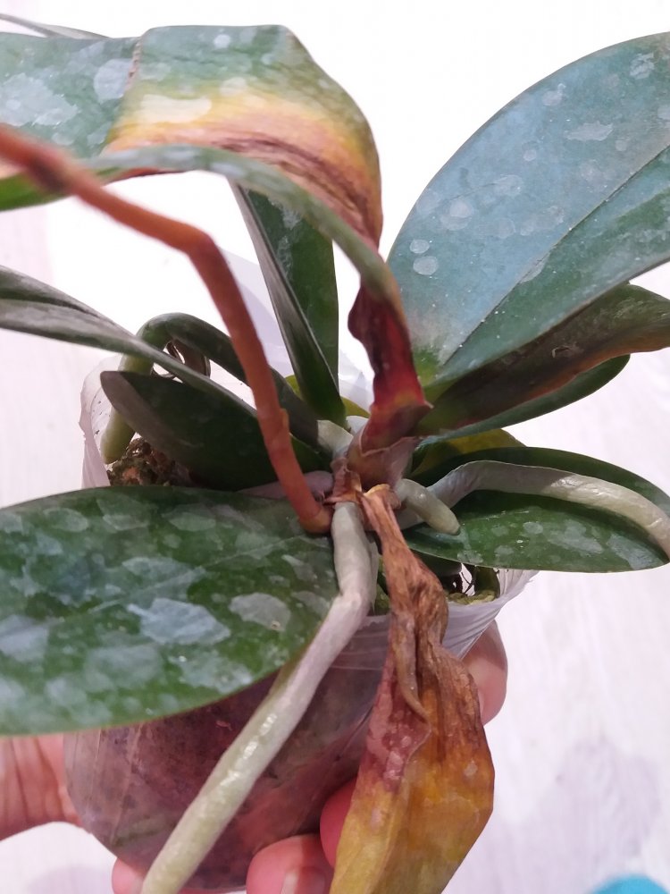 Но случилась беда у меня дома, очень сильно ночью понизилась температура на подоконнике, возможно, ветер еще повернул в сторону окна, и это был ледяной ветер, окна были на "зимнем" проветривании. Очень много растений получили повреждения, обморожения. Один маленький фаленопсис погиб очень быстро, Big Bang сейчас погибает. Ничего не помогает, скорее всего, погибнет, корней почти нет, листья сохнут.
