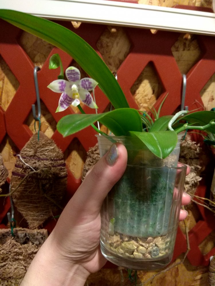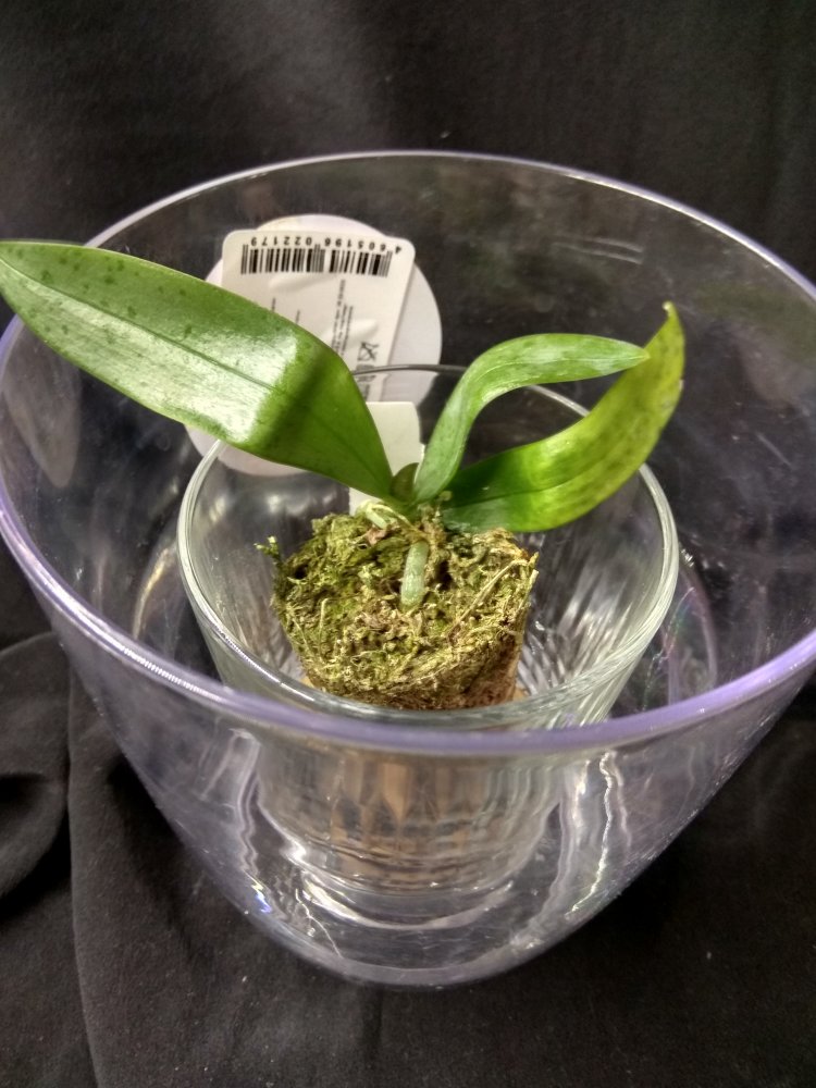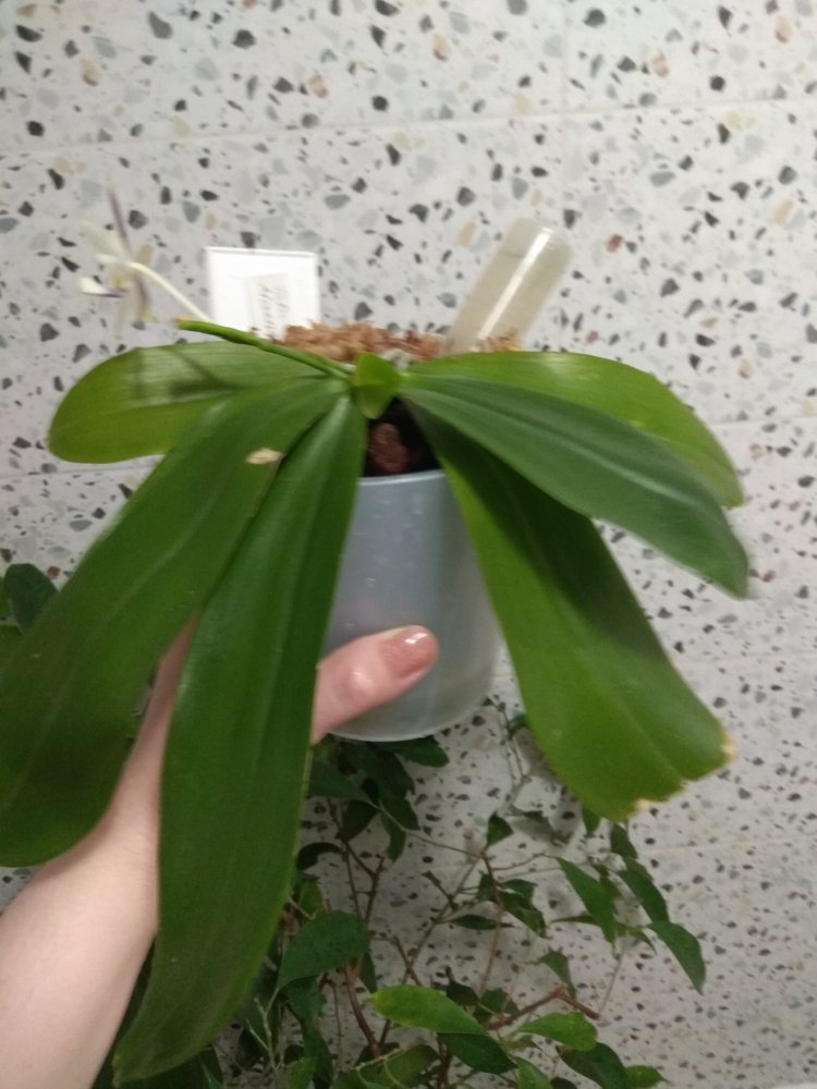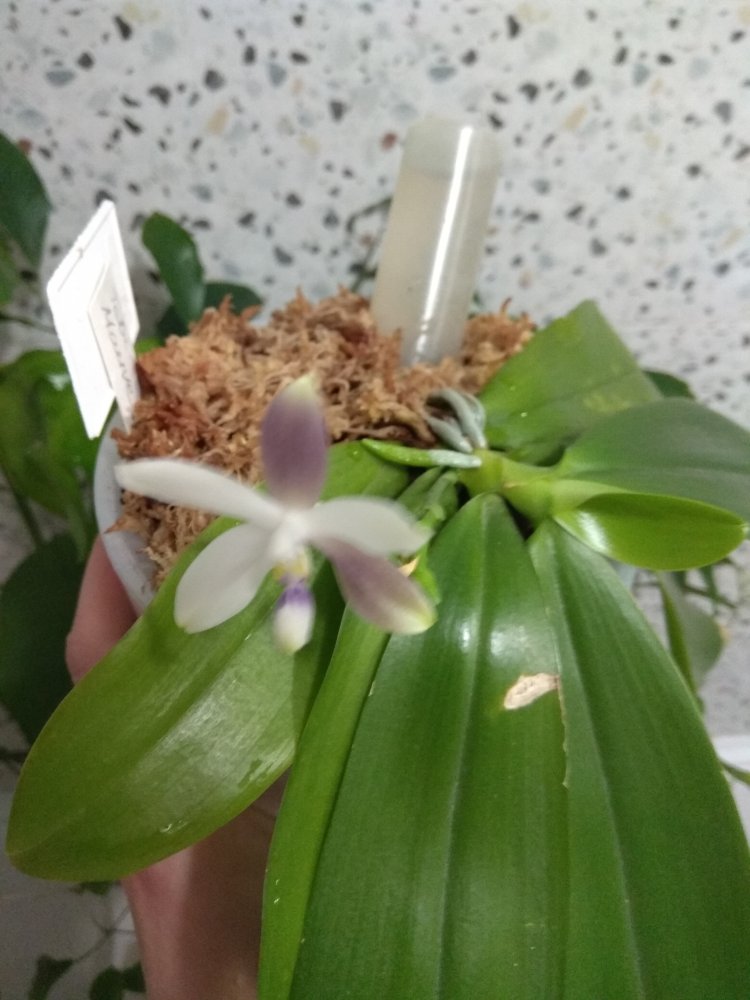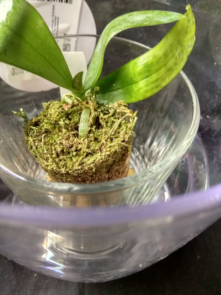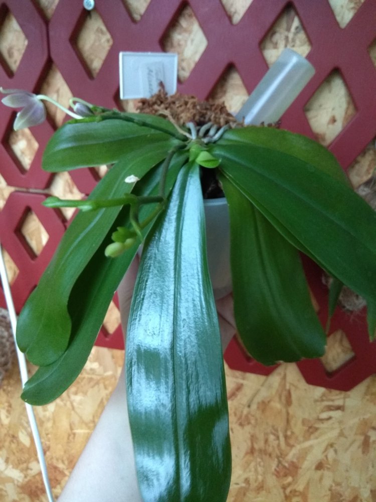 Phal. Golden Peoker x Sogo Lawrence, получен в июле 23. Отрастил лист и цветонос, но ещё не до конца распустился )