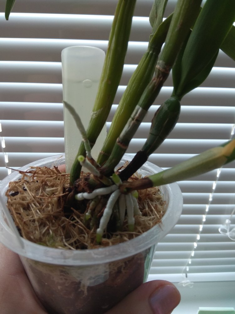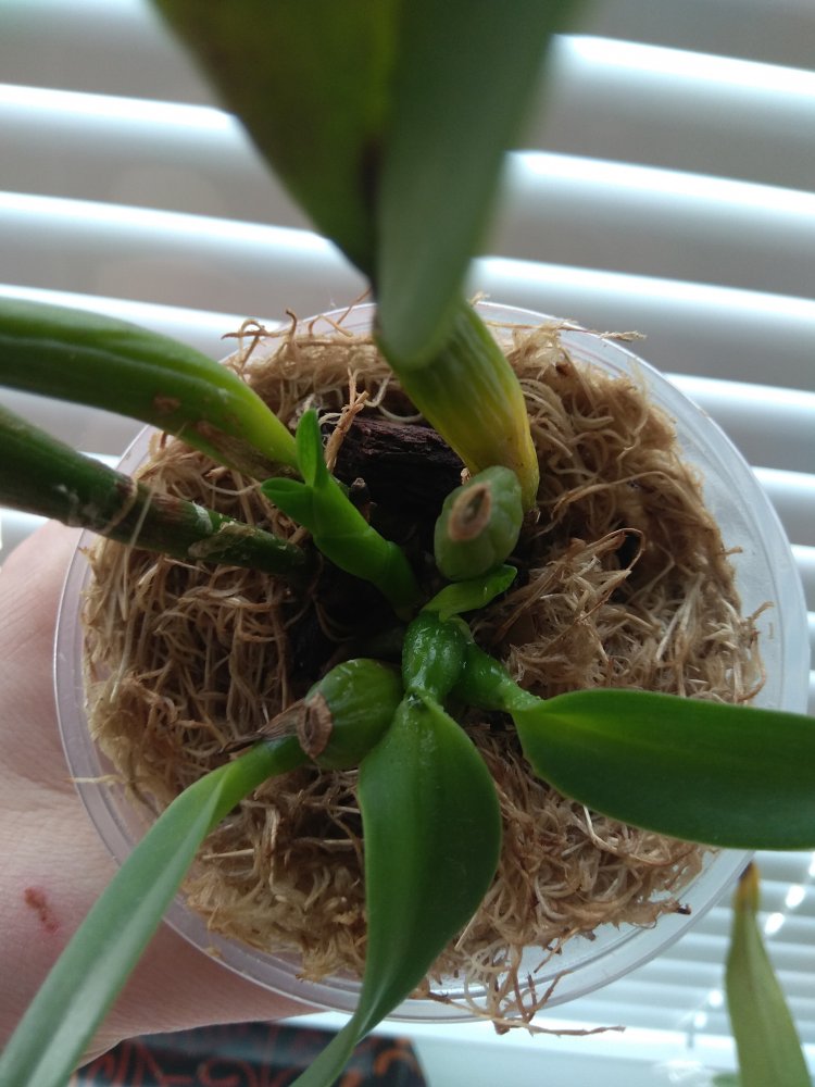 Спустя какое-то время, при пересадке, я обнаружила, что в горшке находится не одно, а 3 совершенно самостоятельных растения. Я рассадила их отдельно, одно "ушло" к знакомой, а 2 других остались у меня: у них совершенно одинаковое все: грунт, удобрения, полив, освещение... Но ведут они себя совершенно по разному: одна "взорвалась" корнями, а вторая - псевдобульбами.