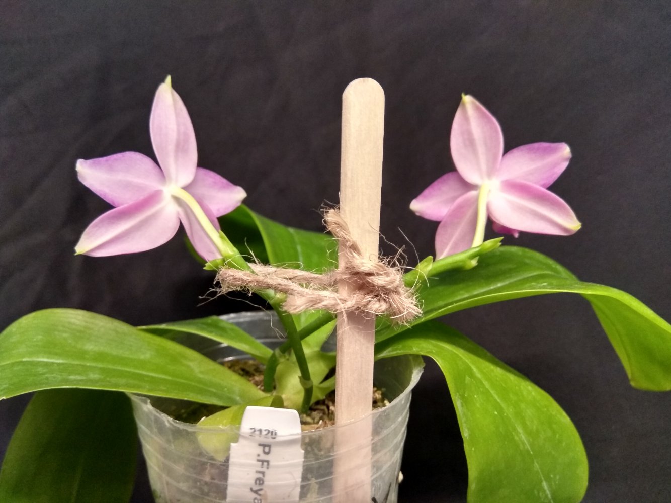 Из Спецпредложений в данный момент цветёт KV Perfume Glow. Пришёл в размере 2.5, большим крепким растением. Выпустил три цветоноса (один притормозил), на двух распустил цветы. По сорту.