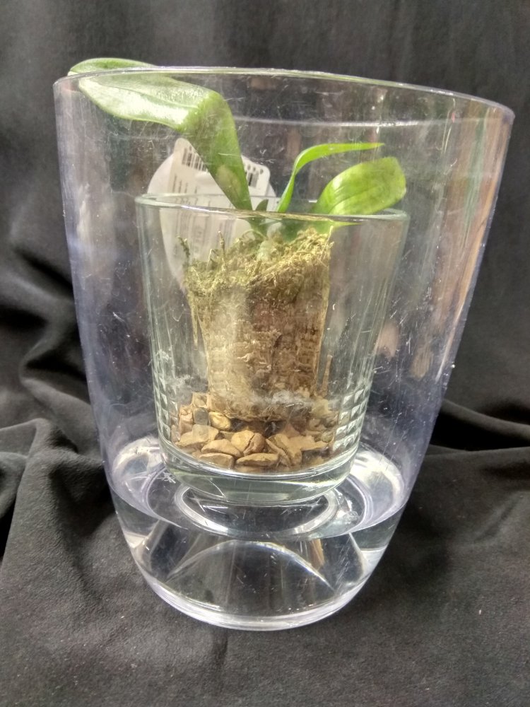 В стеклянном стакане на дне цеофлора, в кашпо - вода. Транспортировочный горшок снят, чтобы избежать перезалития и обеспечить дополнительный доступ воздуха к корням. Поливать маленькими порциями.