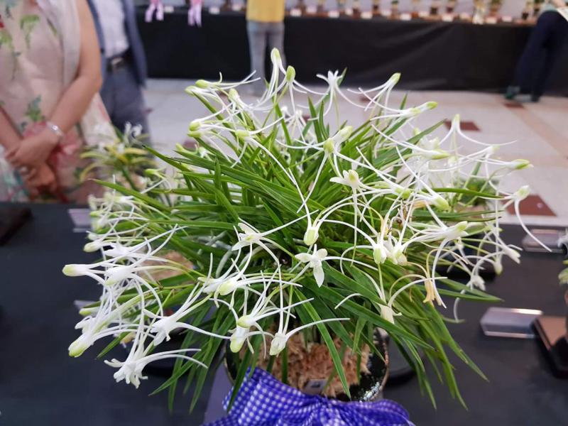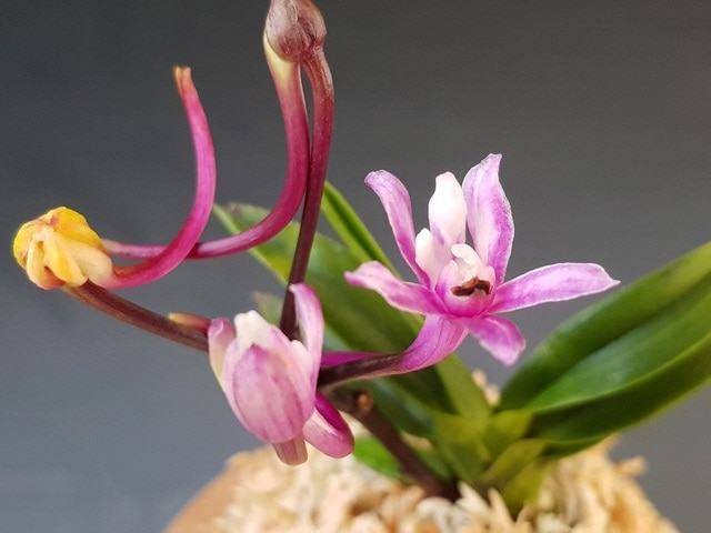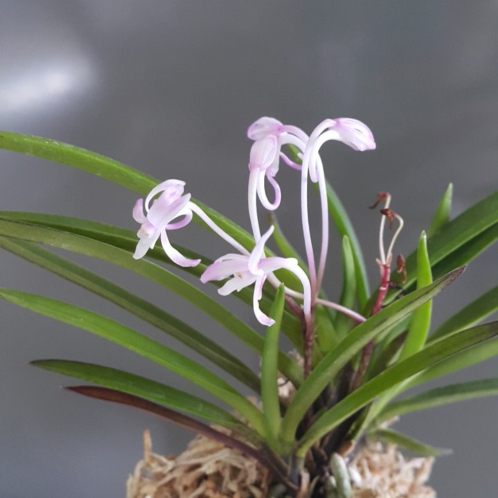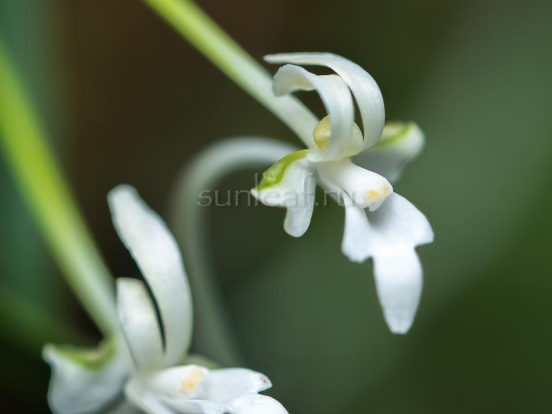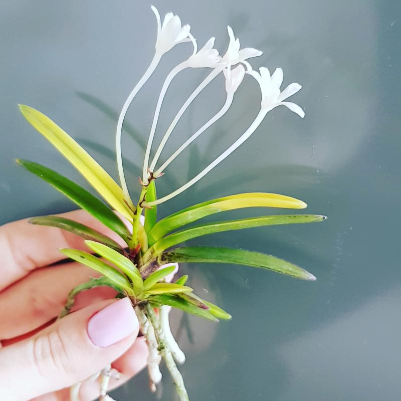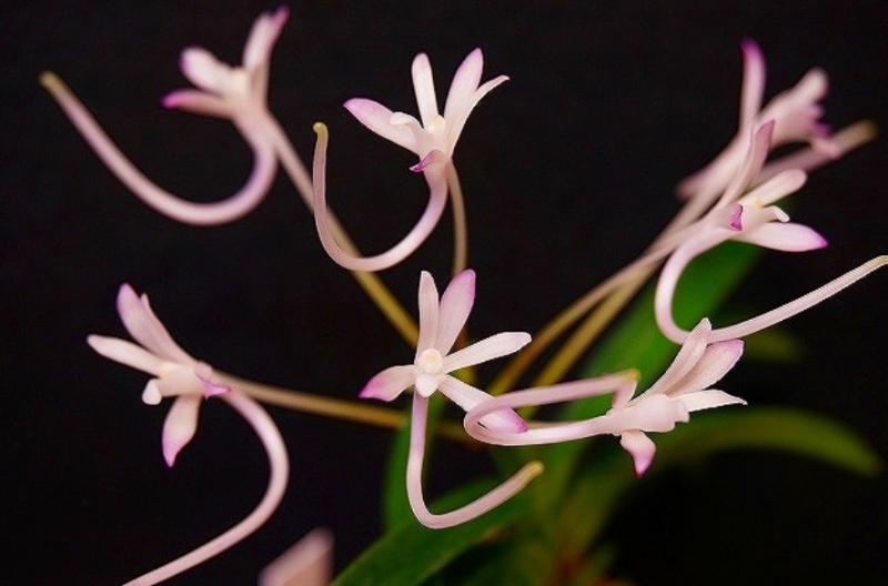 Hanamatoi Это редкое растение ценится за свой необычный цветок, который имеет три шпорца. Растение с тонкими листьями, коричневого цвета ствол и корни. Место соединения листа со стволом в форме месяца.