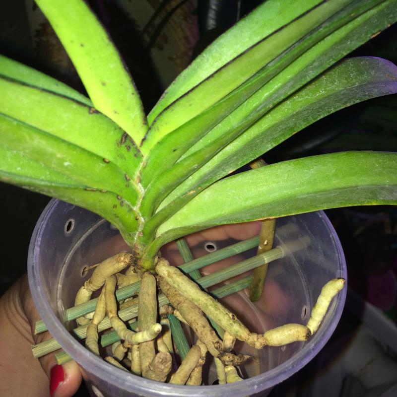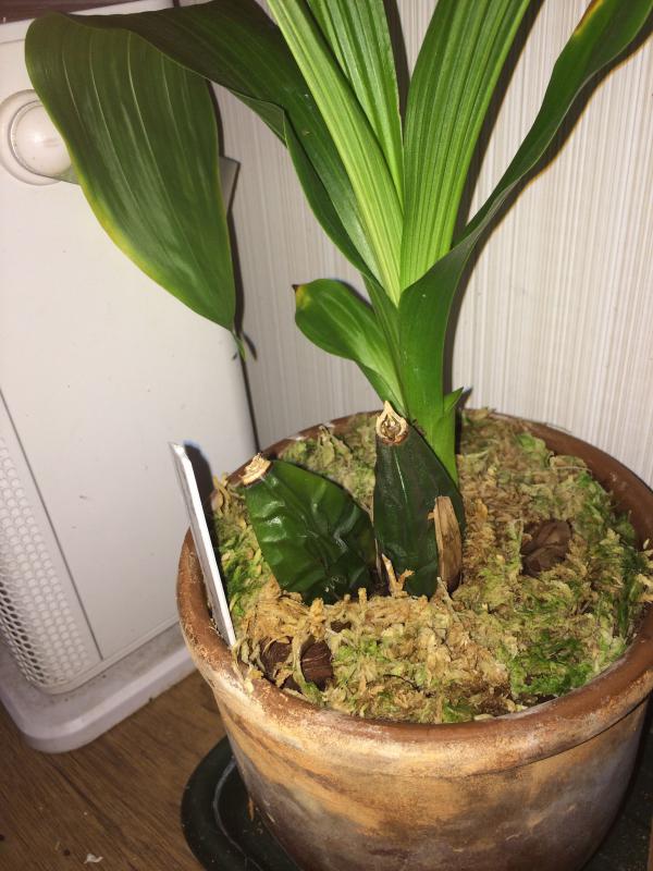 По приходу развалился на два куста, один из них и продается, 5 бульб, в том числе одна еще растет, посажен в керамический горшок, кора, уголь, кокос, на дне керамзит.