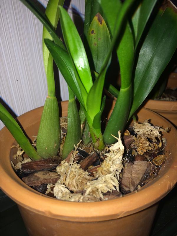 2. Miltonia Sunset, получена в прошлом году от Orchideengarten Karge, тоже сильно разрослась и пришлось поделить. Растит новый рост, посажена в керамический горшок, кора, уголь, кокос, на дне керамзит, у меня не цвела.