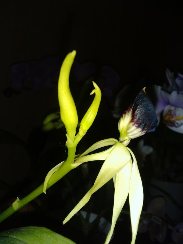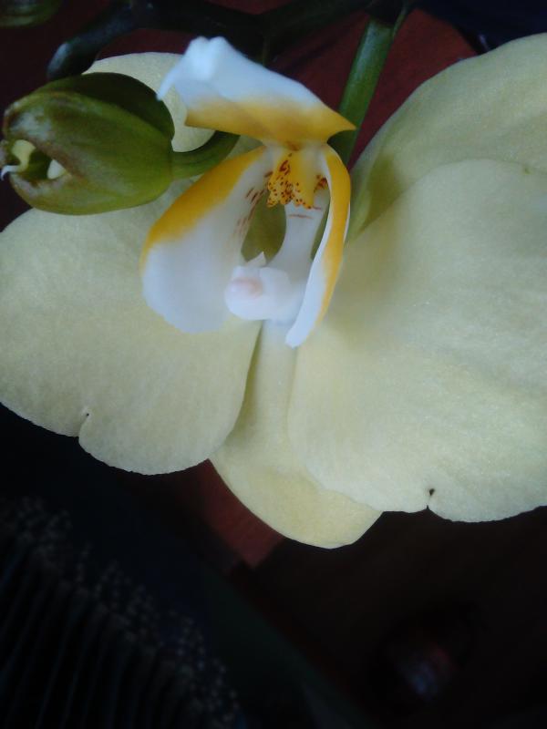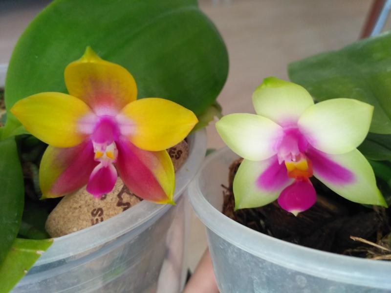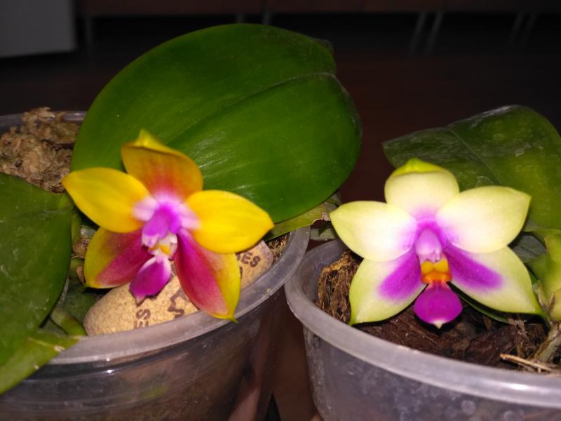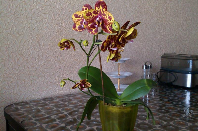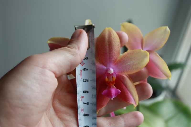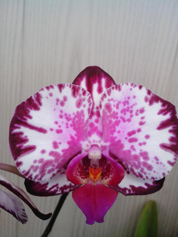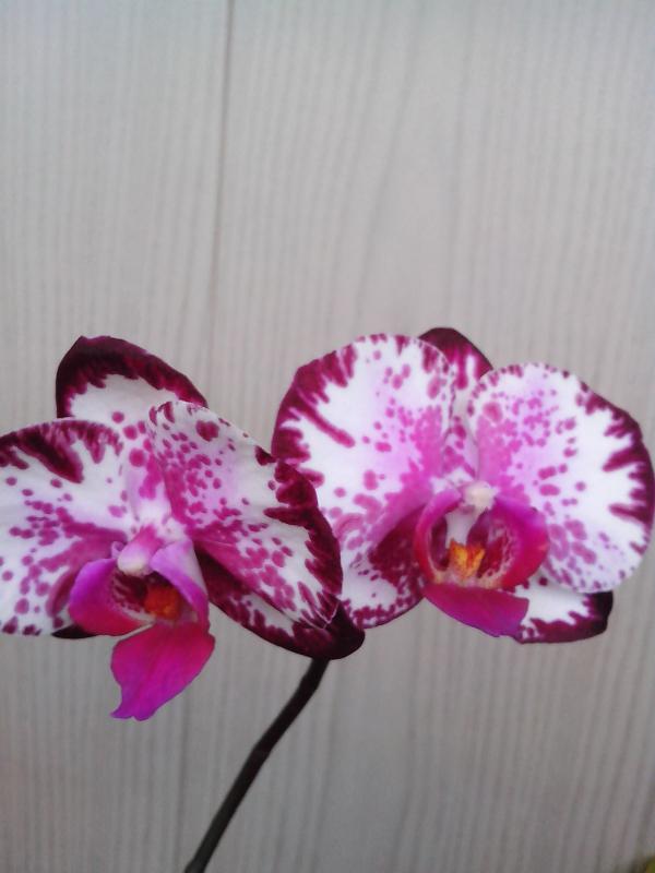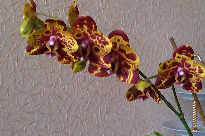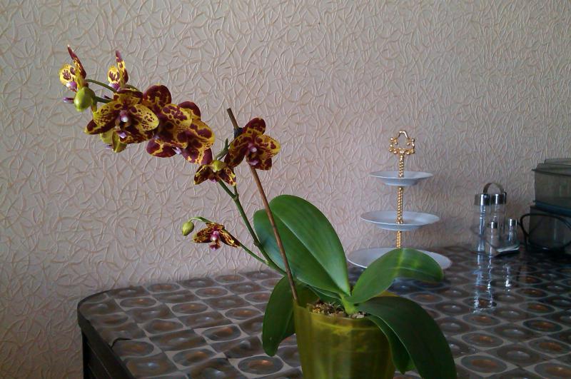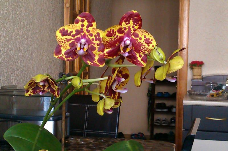 Дать второй цветонос он поленился, а пустил его из почки на старом. На этот раз цветки поопрятнее, крупнее (самый большой - 9.5 см против 7.5, как в прошлый раз) и бутонов 7 (а не 2 как в январе). Окрас таким же и остался (розовые пятна с темно-малиновыми штрихами). Цветков раскрылось 4 (четвертый раскрылся в противоположную сторону - результат поворота горшка).