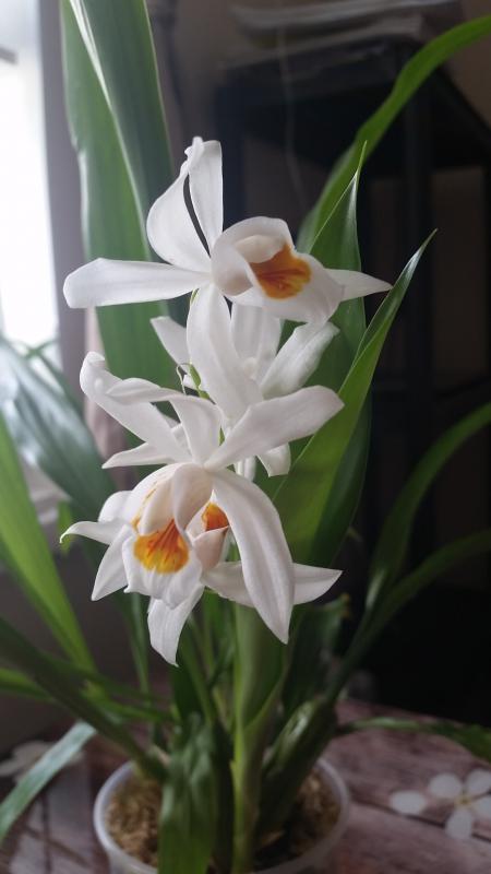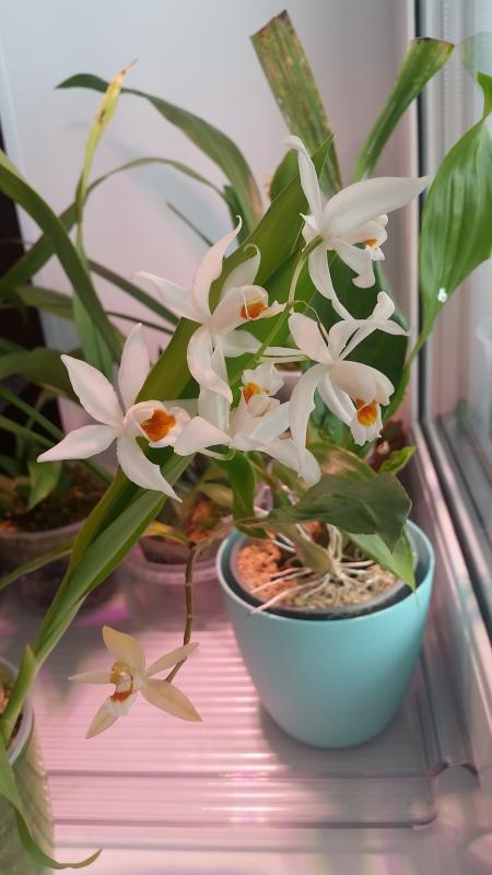 . И еще цветут мои целогины - мои два пересорта, одну заказывала у Швертера в том году как Coel.parishi на ochracea, а расцвела mooreana на ochracea, ну я нисколько не расстроилась, тк растение шикарное и пахнет изумительно, смотрю и не могу налюбоваться))).А другая, у которой маленькие цветочки, я покупала как целогину Покахонтас, но оказалась совсем не она, а coelogyne lentiginosa на monilirachis, но тоже ничуть не жалею, тк цветет она аж с марта месяца и с двух цветоносов. В общем, люблю их).