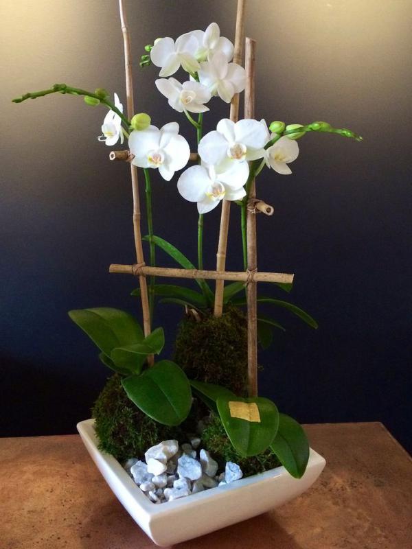 Затем на основу сажаем орхидею, расправляя корни по поверхности шара-основы. Тут важно учесть то, что не учли флористы на фото выше - закапывать шейку фаленопсиса в шар не стоит, и это же касается ризом. В идеале орхидея шейкой/ризомой не должна касатся шара. Предварительно корни замачиваются в воде, чтобы не были слишком ломкими. Оборачиваем корешки по всей поверхности шара-основы и потом покрываем еще одним слоем сфагнума и получившийся шар закрепляем леской. При желании укладываем и закрепляем тонко леской зеленый декоративный мох (его прикрепить можно всегда, когда захочется потом).