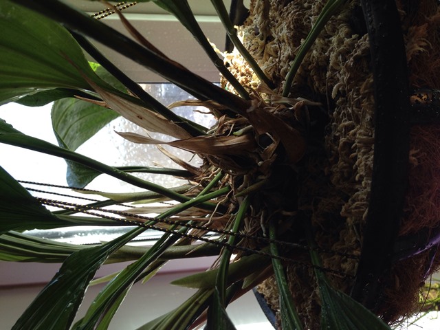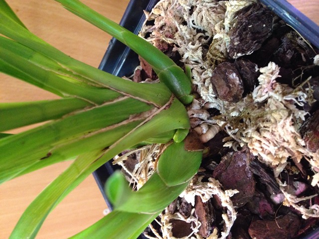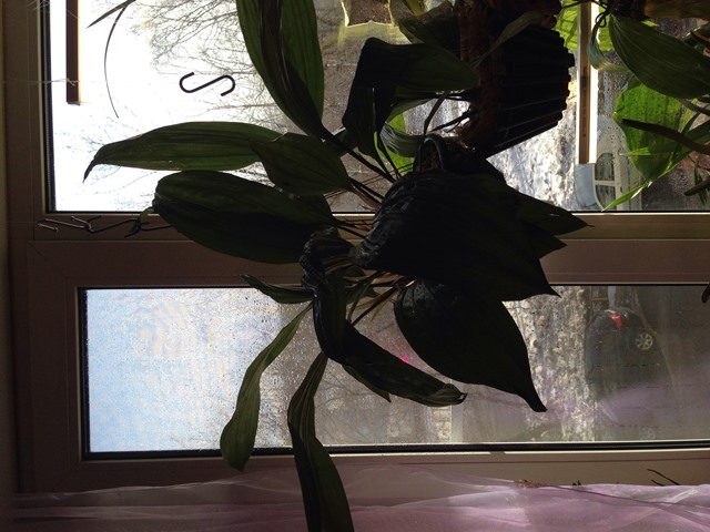 4. Stanhopea Warscewiczi полученная 24.05.2014г. от WaterOrchids в размере 3 листов, у меня набрала массу, сейчас больше 20 бульб, но не цветет. не давно перевалена из старой корзинки в новую, несколько кончиков листочков в мороз подмерзли, обрезаны, обработаны зеленкой. Так как продавать не очень хочется, цена высокая, а вдруг испугается)))