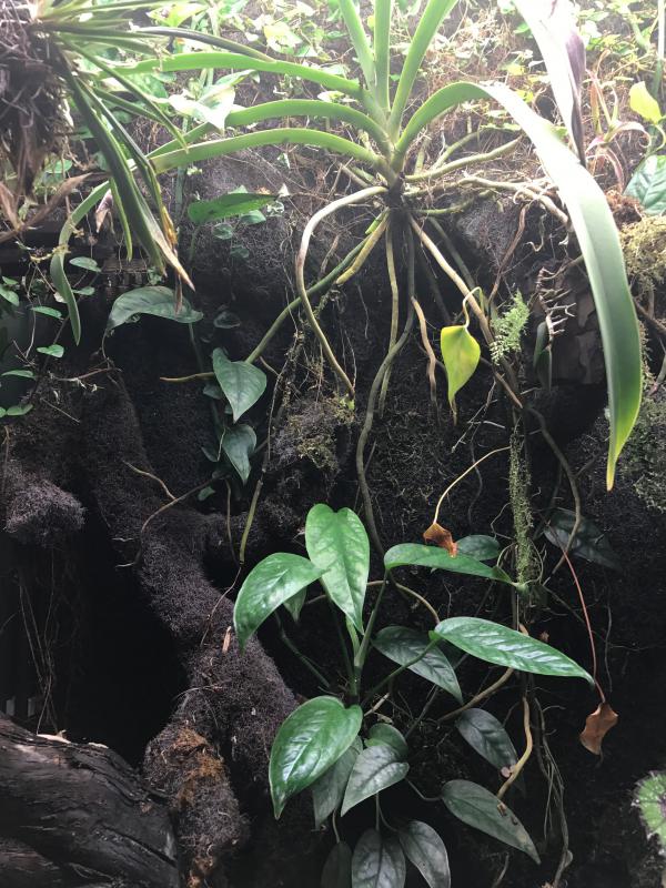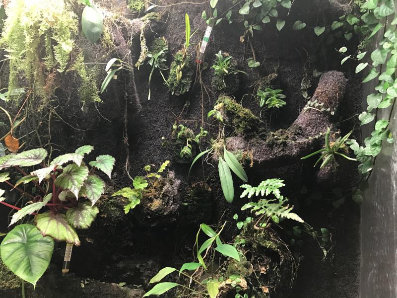 Проблема в том, что это старое фото, ему где-то года два. Это влажный режим (пролив фона 1 раз в день по часу + 5 раз в день дождевание по 10 секунд + туман один раз на полчаса). Так вот, проблема как в том анекдоте, где мужик ходил по рынку с медведем и искал, кто ему хомячка продал. Маленький с ладошку спатефиллум (на переднем плане. Кстати, он вообще в воде растет) вымахал в полуметровое чудовище. Неорегелия мейендорфа (слева) заполонила четверть ширины. Но хуже всего дело было с аллоказией клипеолятой - она из десятисантиметрового стрючка вымахала больше метра. Более того, накидала везде своих шишек. Растения уже нет, а ее шишки все прорастают и прорастают. Кстати, никому не надо? В общем, меня это все задолбало, да и времени нет на влажный вивариум. Поэтому я решил перейти к орхидеям. Для этого я продрал все жестко, выдрал все, что крупнее ладони и начал его сушить. Сейчас режим полива: раз в неделю пролив фона на час + два раза в день дождевание по 15 секунд. Пока временное размещение всего, т.к. я размышляю, как мне сделать возможность опускать температуру до 15 градусов. Там на фото видны разложенные термометры в разных зонах. Я слежу, где и что с температурой происходит. Да и еще нужны кое-какие коррективы с движением воздуха.