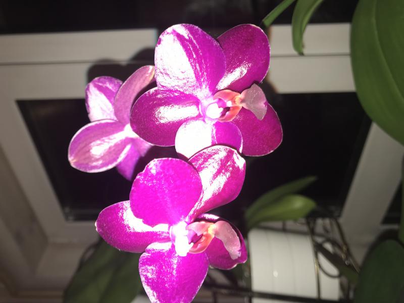 Цветет постоянно с октября 2017, правда на цветоносе одновременно не более 3-4 цветов, когда вызревает новый бутон один цветок постепенно засыхает. Цветок в точности такой же глянцевый как и на промофото.