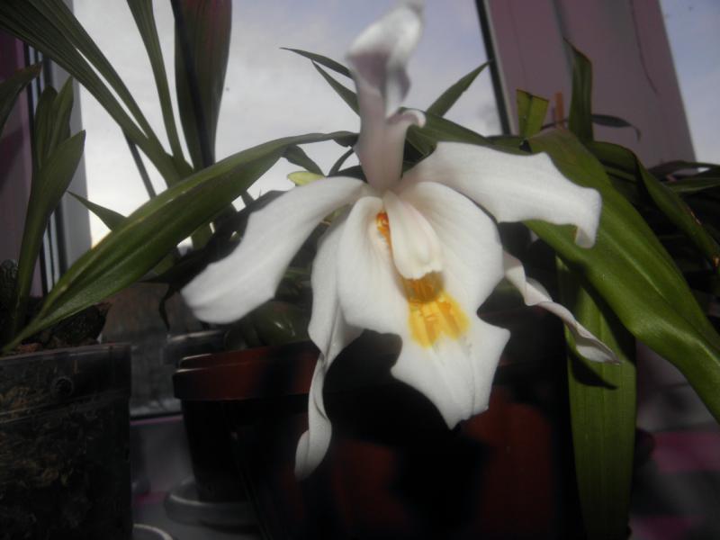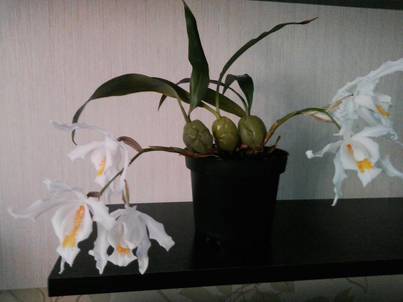А у меня Coelogyne Cristata от Карге, получена в 2017, первое домашнее цветение, три цветоноса, но пока только один цветочек распустился