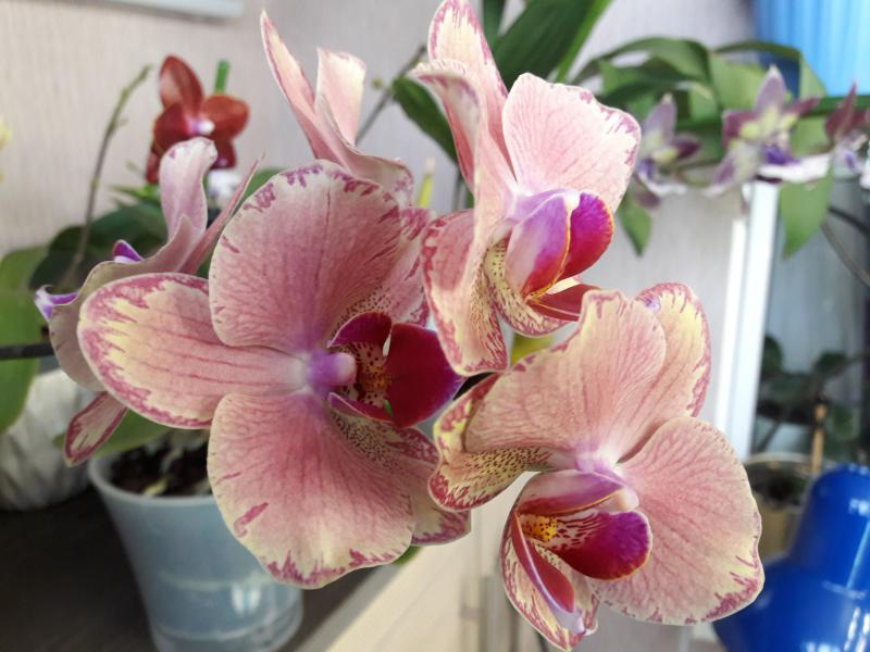 Первое цветение Paph. Barbatum от Швертера. Растение очень компактное, растит сразу много розеток. Размах листьев у цветущей сейчас розетки около 30 см, остальные меньше. Цветонос в высоту 28 см, цветок 9 см. В уходе не требовательный, не кальцефил, растет быстро даже в условиях низкой освещенности, но для цветения необходимо досвечивать.